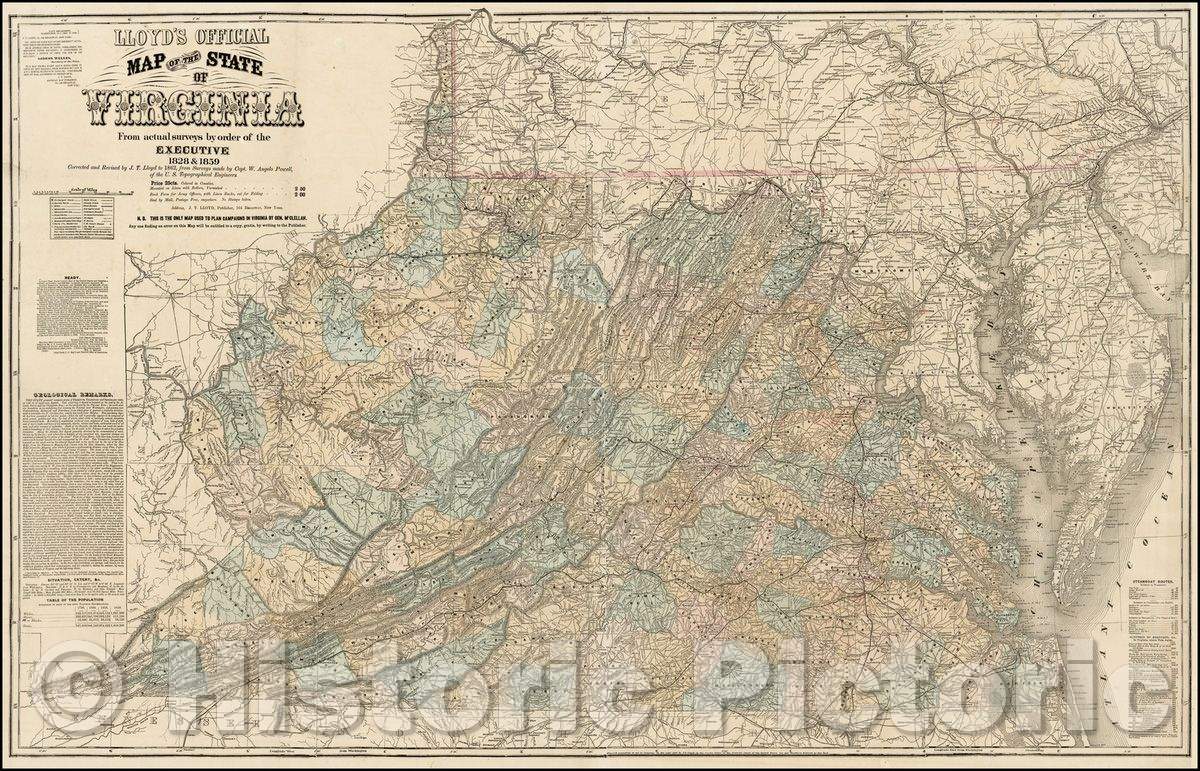 Historic Map - Lloyd's Official Map of the State of Virginia From actual surveys, 1862, J.T. Lloyd - Vintage Wall Art