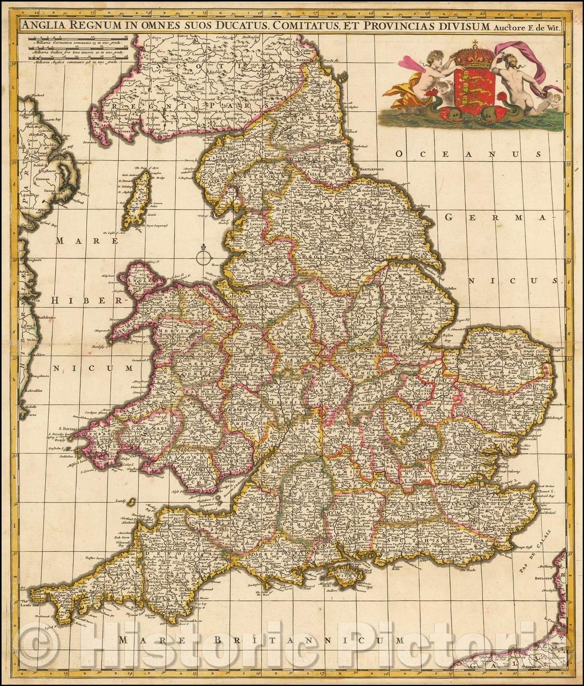 • .Historic Map - Anglia Regnum In Omnes Suos Ducatus, Comitatus, et Provincias Divisum/Map of England and Wales, colored by counties, 1688, Frederick De Wit - Vintage Wall Art
