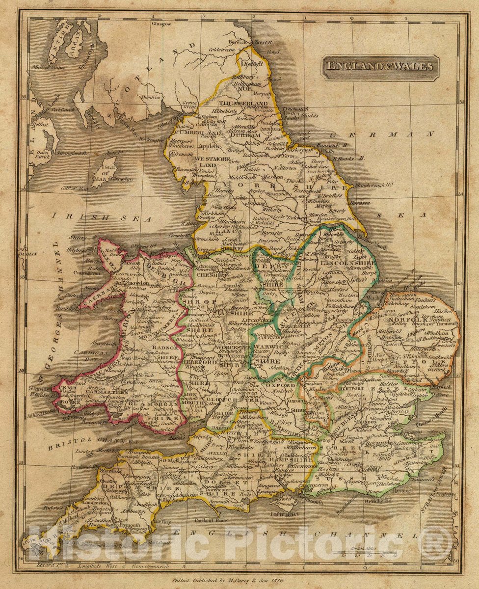 Historic Map : England & Wales. Philad. Published by M. Carey and Son, 1820, 1820 Atlas - Vintage Wall Art