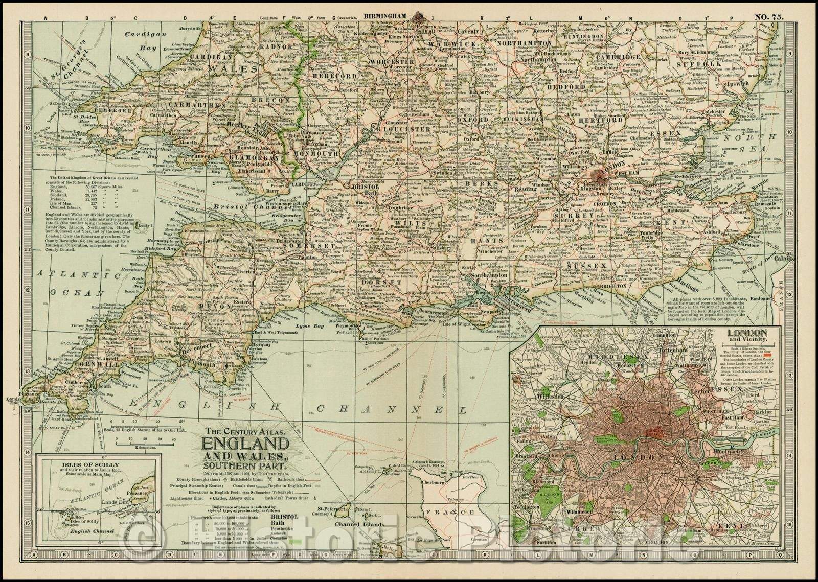 Historic Map - England and Wales, Southern Part, 1897, The Century Company - Vintage Wall Art