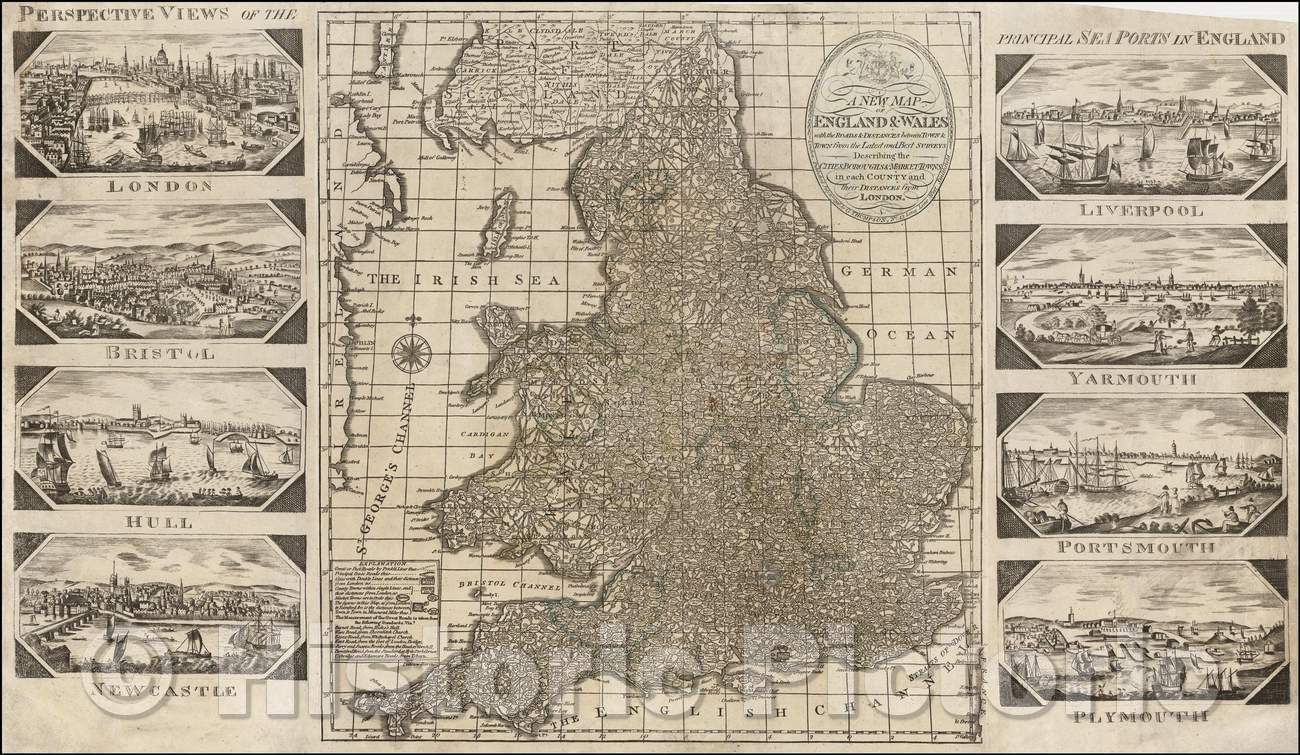 • .Historic Map - England & Wales with the Roads & Distances between Town & Town from the Latest and Best Surveys Describing the Cities, Buroughs, Market, 1798 - Vintage Wall Art
