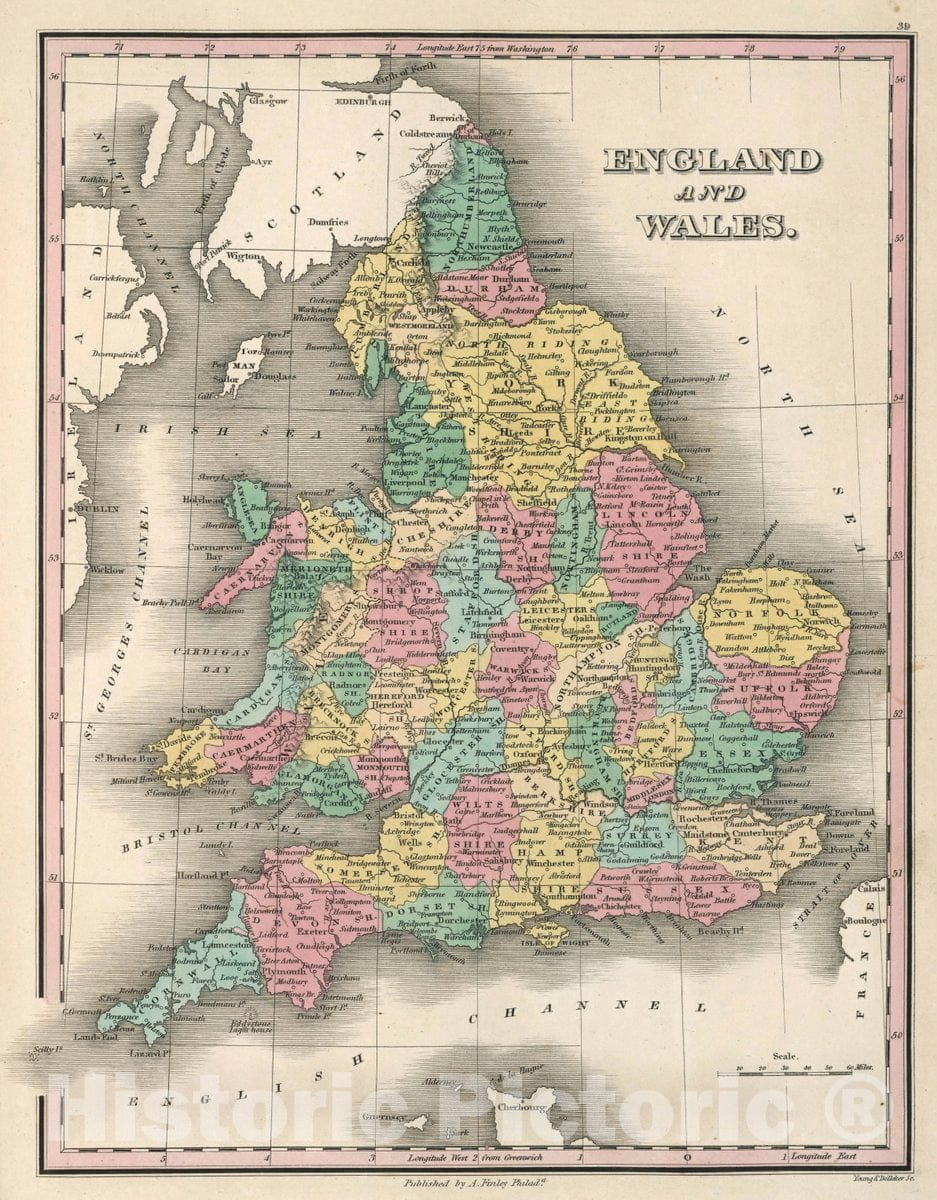 Historic Map : England and Wales. Young & Delleker Sc. Published by A. Finley, Philada, 1827 Atlas - Vintage Wall Art