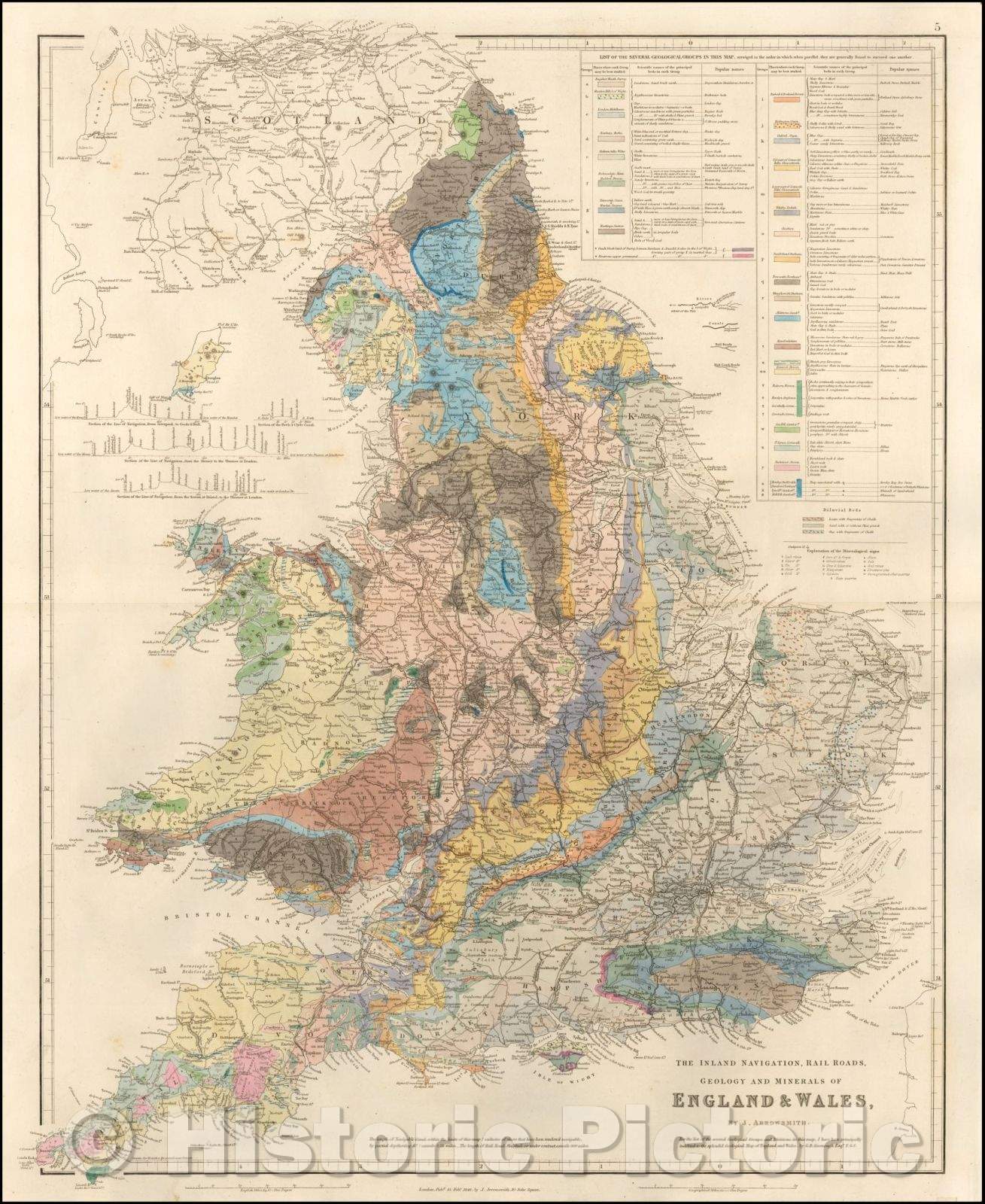 • .Historic Map - The Inland Navigation, Rail Roads, Geology and Minerals of England & Wales, 1842, John Arrowsmith - Vintage Wall Art