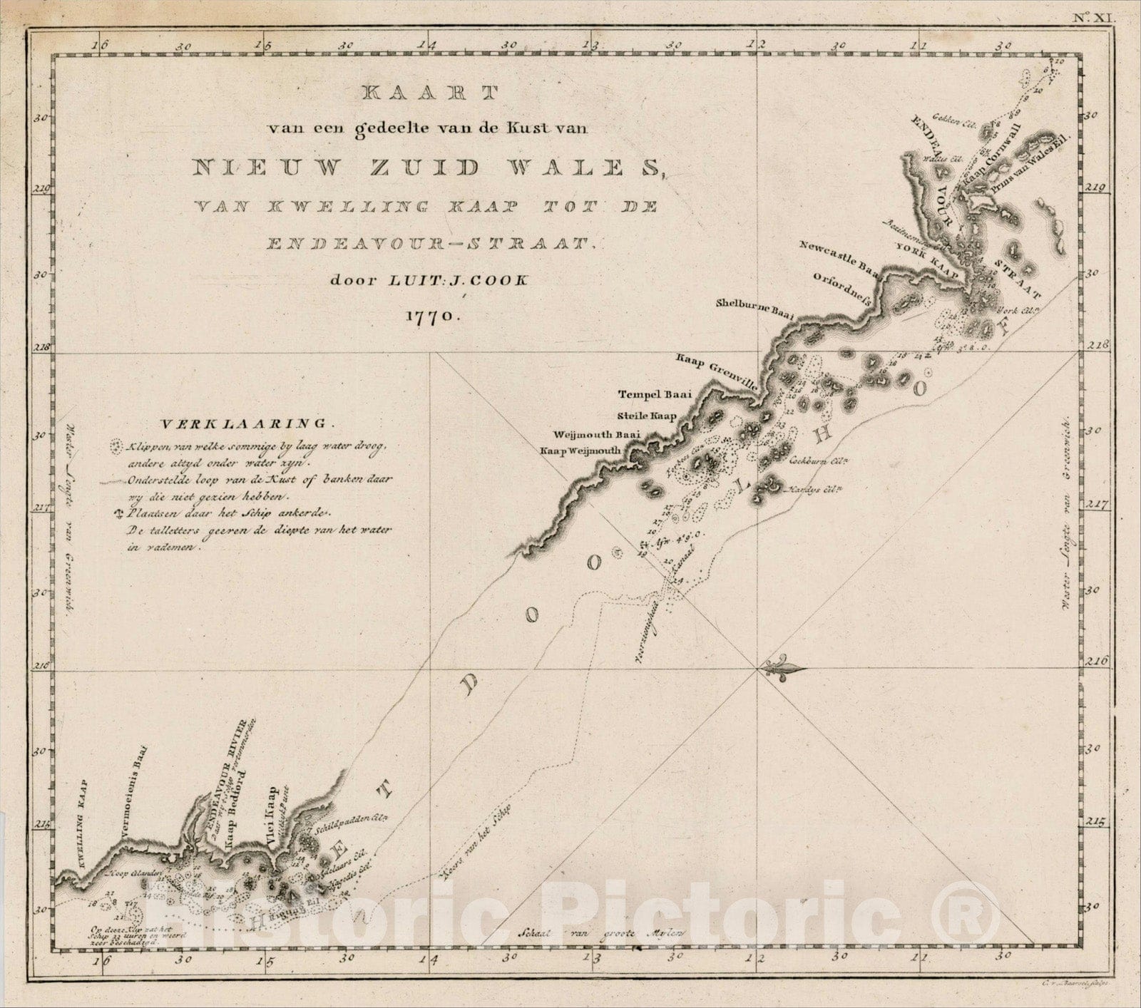Historic Map : Kaart van een gedeelte van de Kust van Nieuw Zuid Wales, Van KewellingKaapt Tot De Endeavor-Straat door Luit: J. Cook 1770, 1794, , Vintage Wall Art