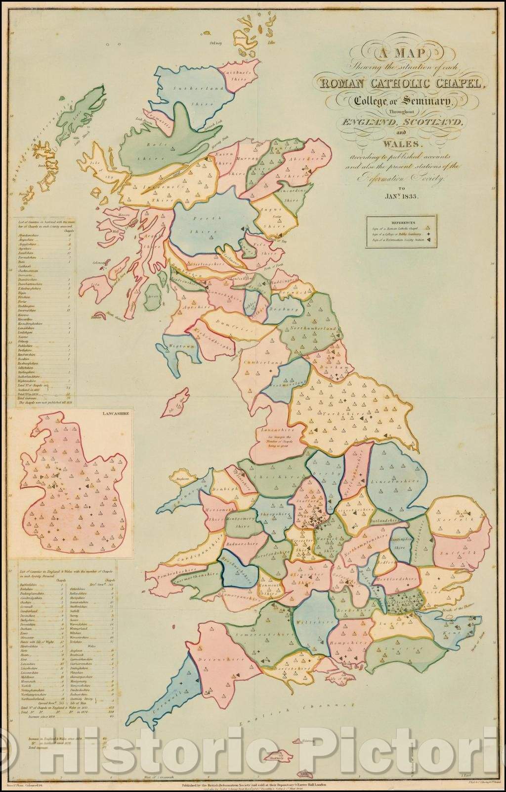 • .Historic Map - A Map shewing the situation of each Roman Catholic Chapel, College or Seminary, throughout England, Scotland, and Wales, 1833 - Vintage Wall Art