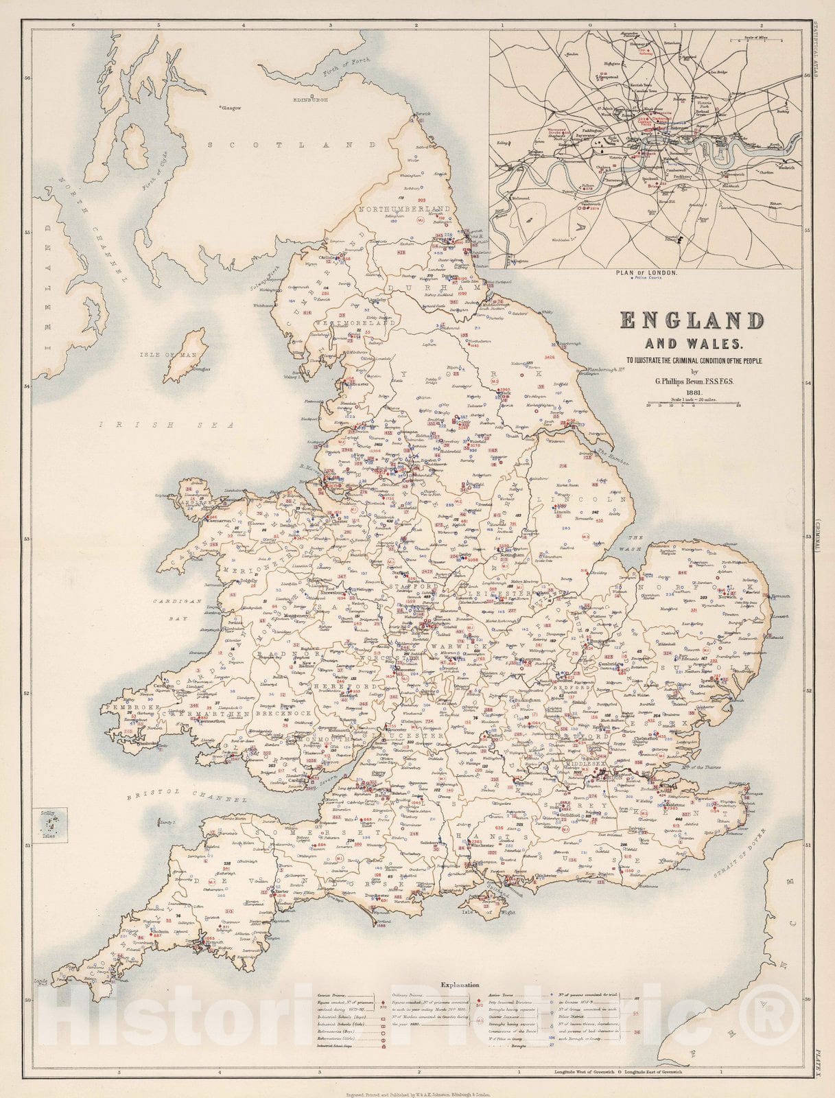 • .Historic Map : Statistical Atlas - 1881 England and Wales to Illustrate the Criminal Condition of the People. - Vintage Wall Art