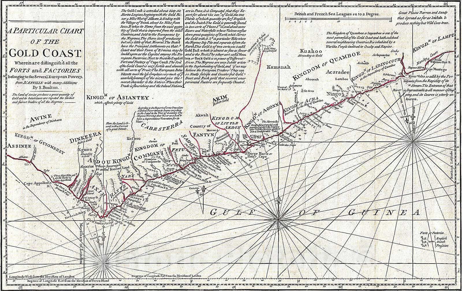 This is probably the most important map of Africa produced in the 18th century. Largely based upon the earlier D'Anville map, this map has been enlarged and expanded by Samuel Boulton. Depicts the continent in full with insets of the Gold Coast (or Ivory Coast, or Guinea). This map is unique in that it is a serious attempt to compile all of the accurate scientific knowledge of the African continent available at the time. In contrast to many other Africa maps of the period there almost no attempt to fill the "unknown" regions of the interior with fictitious beasts, kingdoms, and geological features. Boulton himself advertises "The inland parts of Africa being but very little known and the names of the regions and countries which fill that vast tract of land being for the greatest part placed by conjecture it may be judged how absurd are the divisions traced in some maps and why they are not followed in this. Despite this, this map actually does provide a wealth of information both in the form of a gazetteer printed in framed text boxes here and there on the map, as well as political and geographical features. This map bears up to almost endless perusal and volumes could be composed on its content. Generally following Ptolemy, Boulton includes a number of mysterious river systems which seem to appear out of nowhere and run to nowhere. In the southern half of Africa there is considerably less information on the interior save for those lands mapped by the Portuguese along the Congo and Zambezi Rivers. Just north of Monomotapa we find an embryonic representation of Lake Malawi, here called Maravi. In South Africa the Dutch Company is strongly established and the region is well mapped well into the interior. Prepared by Samuel Boulton and published by Laurie & Whittle in Kitchin's 1794 General Atlas .