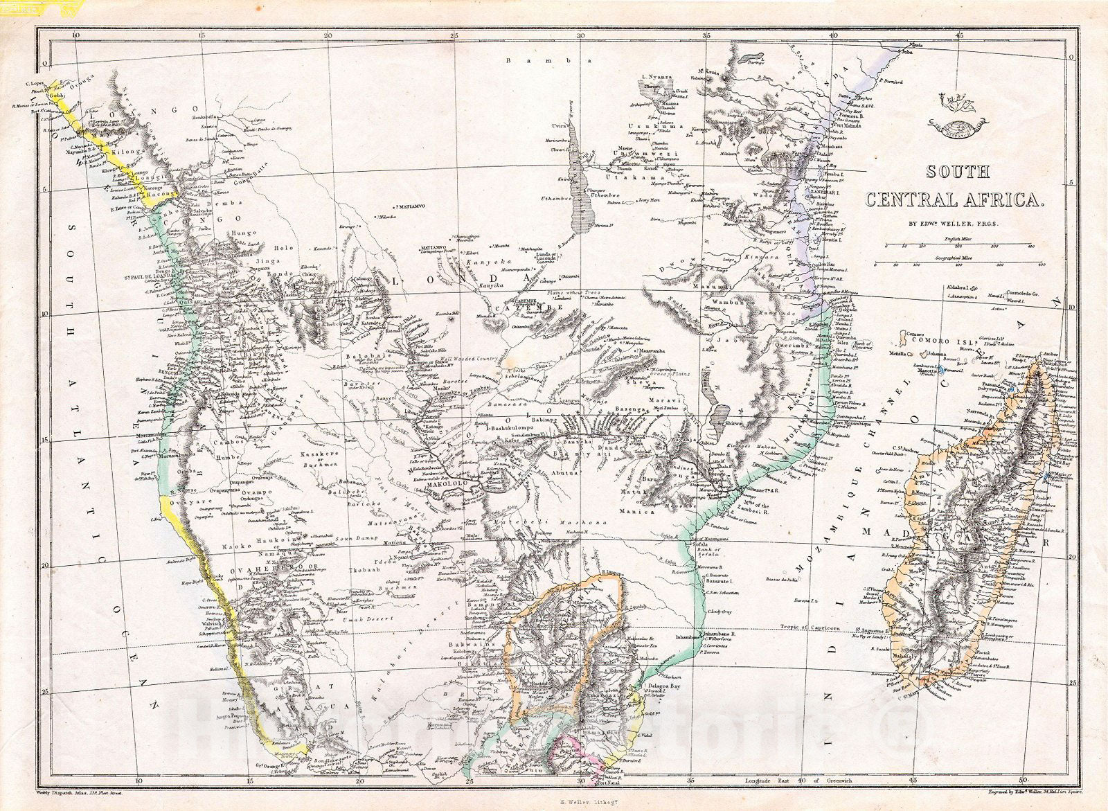 Historic Map : Dispatch, Weller Map of South Central Africa (Angola, Botswana, Tanzania, etc.), 1868, Vintage Wall Art