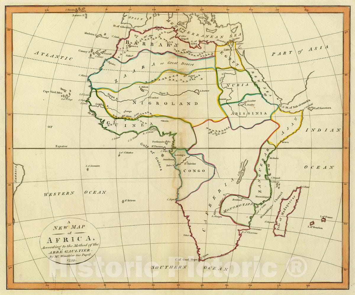 Historic Map : A New map of Africa, According to The Method of The Abbe Gaultier. by Mr. Wauthier, his Pupil. 1799, 1799 Atlas - Vintage Wall Art