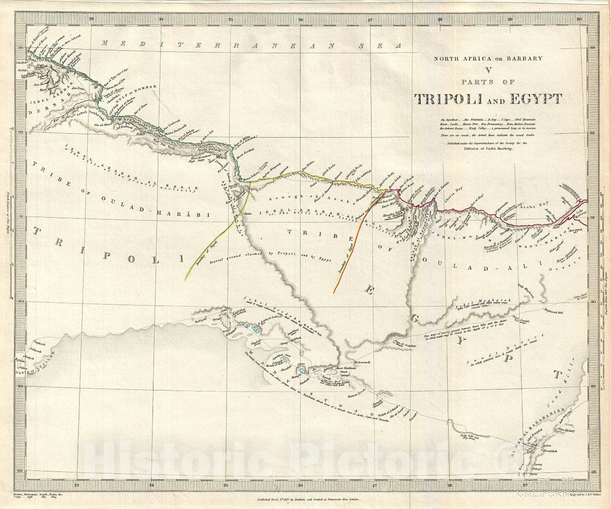 This is a scarce and beautiful 1837 Society for the Diffusion of Useful Knowledge or S.D.U.K. map of parts of Egypt and Tripoli, Libya on the Barbary Coast of Northern Africa. It covers from Al Bayda in Libya east as far as Alexandria, Egypt. The map names numerous tribes throughout, and offers other interesting cartographic annotations. Dry rivers, lakes, oases, tracks, ruins, mountains and other topography is also noted, with relief shown by hachure.