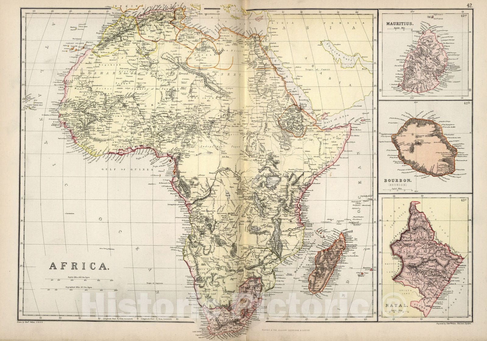 Africa. (inset) Mauritius. Bourbon (Reunion). Natal. | The Comprehensive Atlas & Geography Of The World: Comprising An Extensive Series Of Maps, A Description, Physical And Political, Of All The Countries Of The Earth; A Pronouncing Vocabulary Of Geographical Names, And A Copious Index Of Geographical Positions ... Compiled And Engraved From The Most Authentic Sources, Under The Supervision Of W.G. Blackie Ph.D., F.S.A. Scot. ... B. & S. Lucem Libris Disseminamus. London: Blackie & Son, 49 & 50 Old Bailey, E.C.; Glasgow, Edinburgh, And Dublin. 1882. (on verso) Glasgow: W.G. Blackie And Co., Printers, Villafield. | The color litho maps are by Edward Weller. Ten color litho plates illustrate the races of mankind. Extensive text. Relief shown in hachures. Full color. Gilt edging on pages.