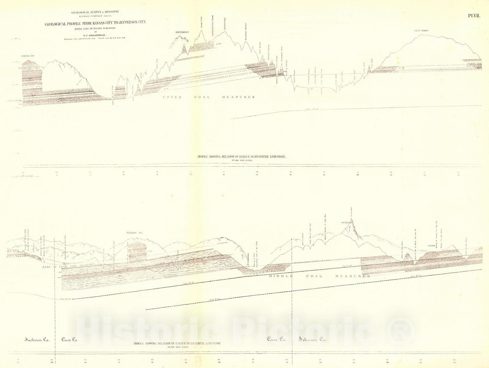 Vintage Map | 1872 Geological Profile from Kansas City to Jefferson City Along Line of Pacific Railroad | Broadhead, G.C.