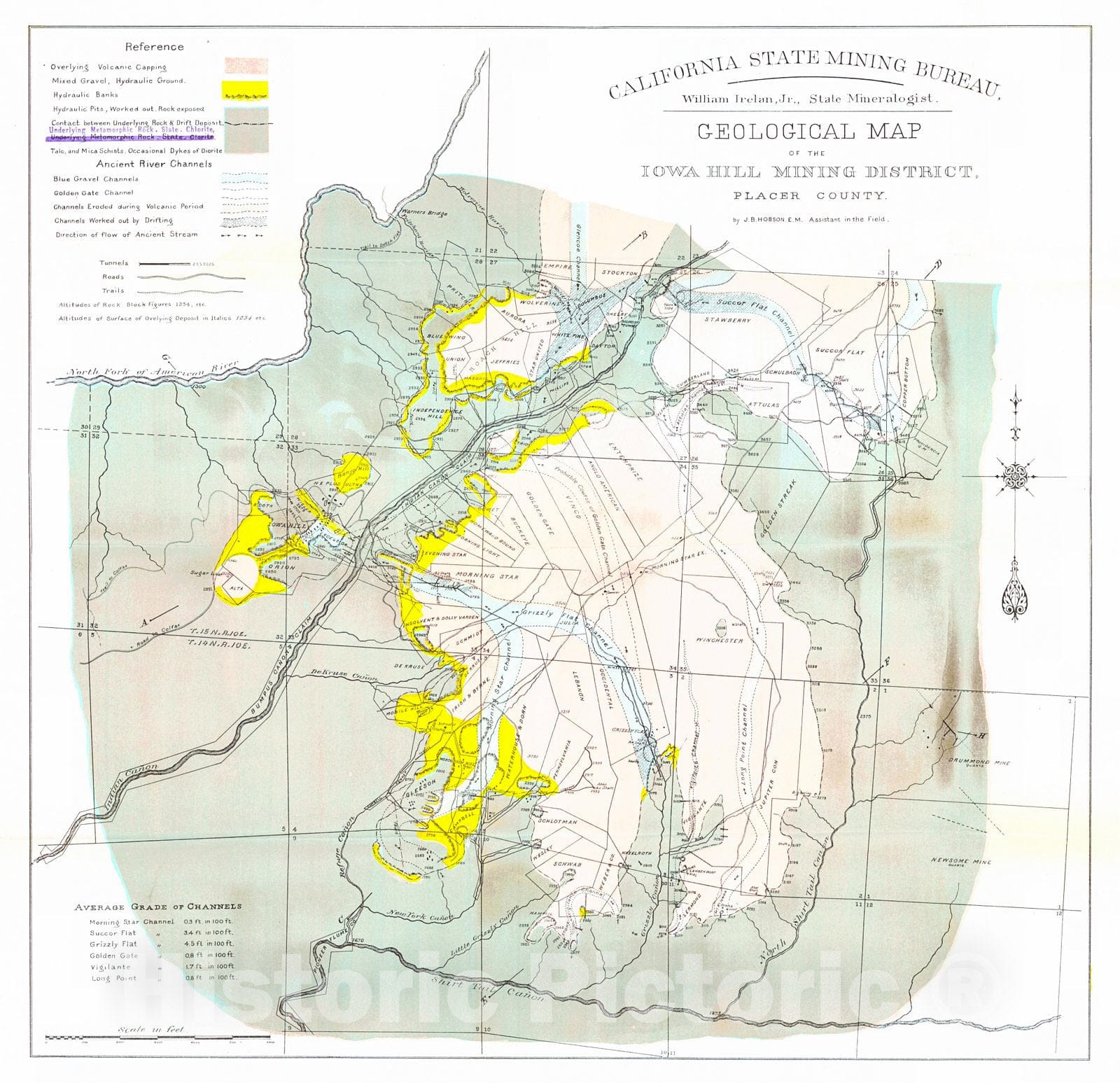 Historic Map : 1890 Geological Map of the Iowa Hill Mining District, Placer County : Vintage Wall Art