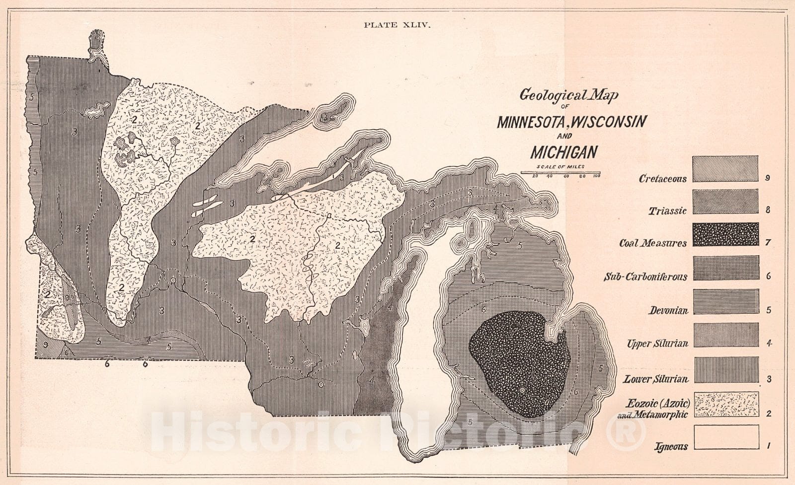 Historic Map : 1890 Geological Map of Minnesota, Wisconsin and Michigan : Vintage Wall Art