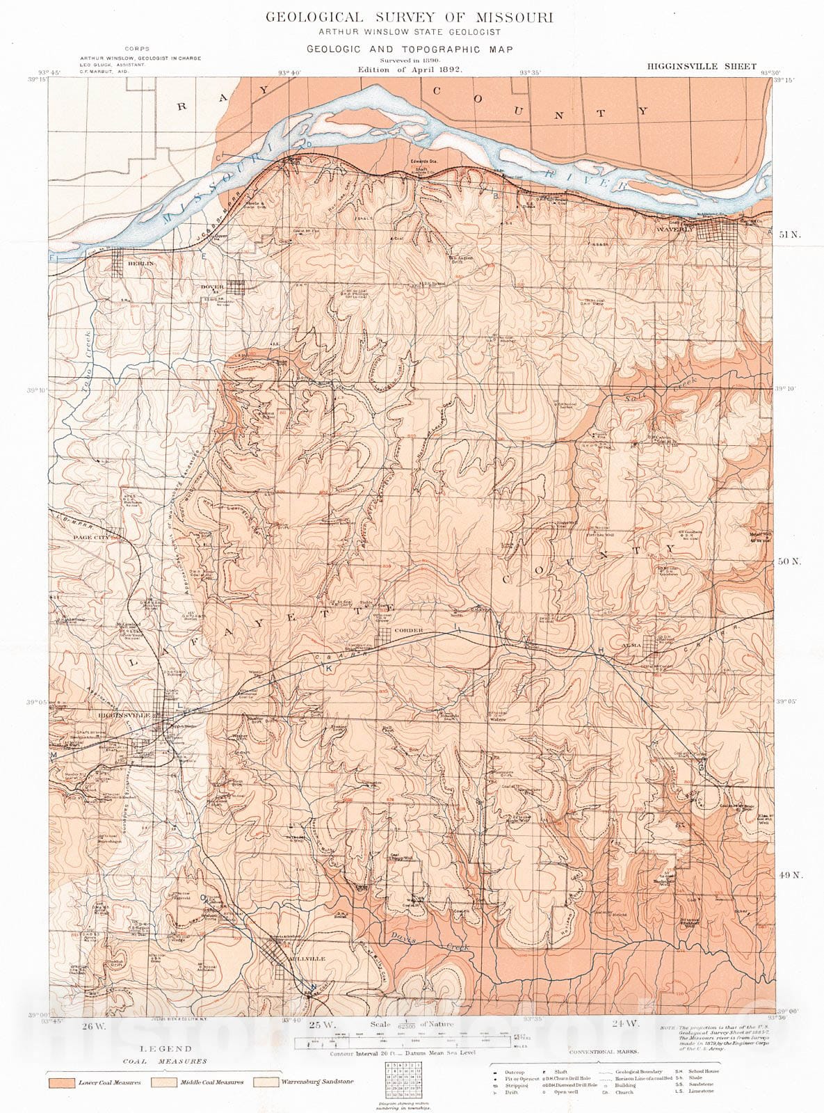 Vintage Map | 1892 Geologic and Topographic Map - Higginsville Sheet | Geological Survey of Missouri