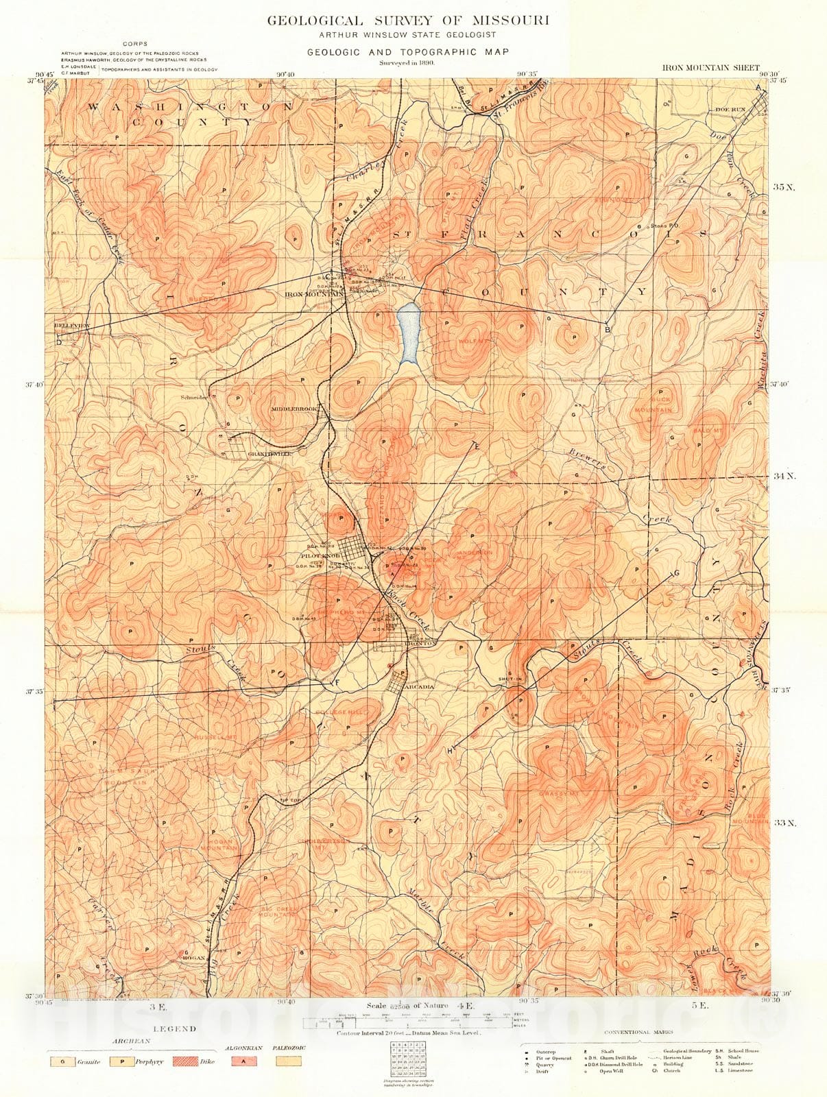 Vintage Map | 1892 Geologic and Topographic Map - Iron Mountian Sheet | Geological Survey of Missouri