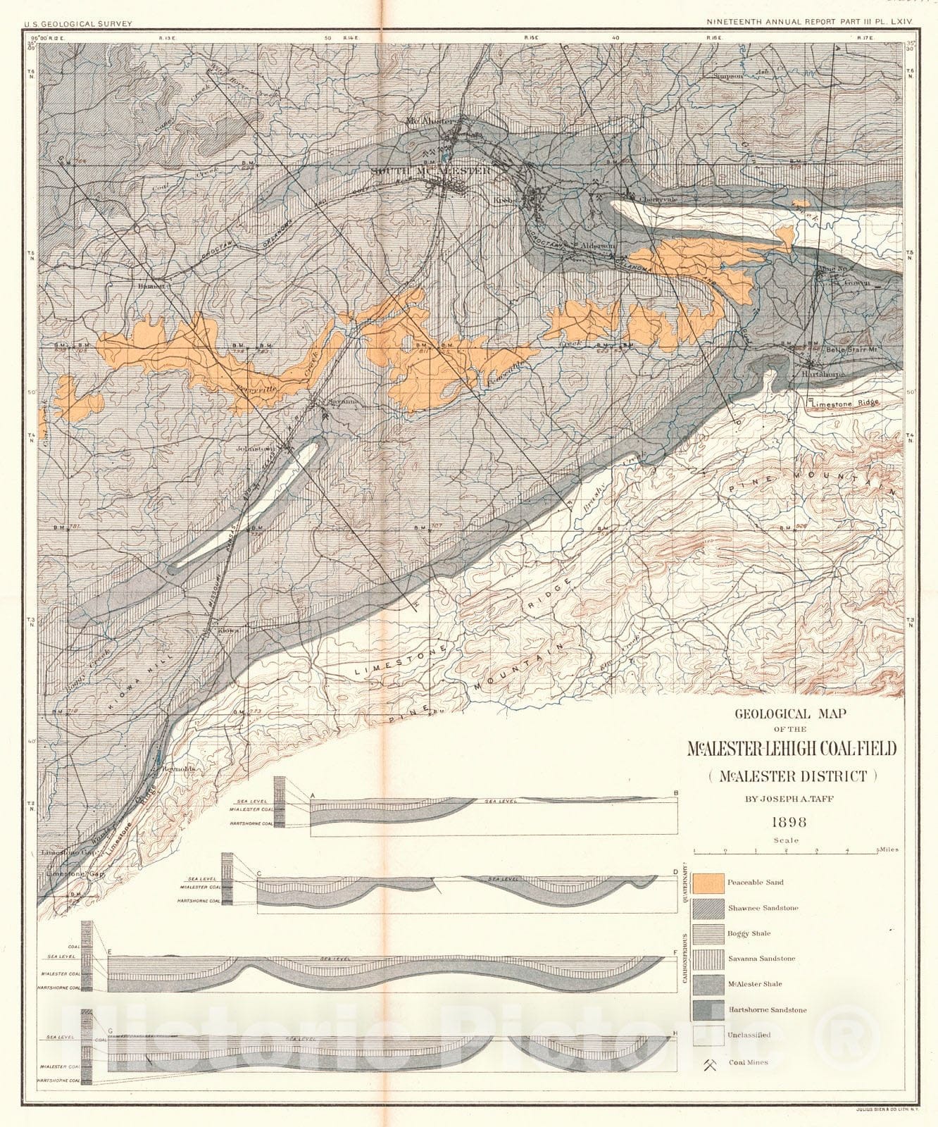 • Historic Map : 1899 Geological Map of the McAlester-Lehigh Coal-Field (McAlester District) : Vintage Wall Art