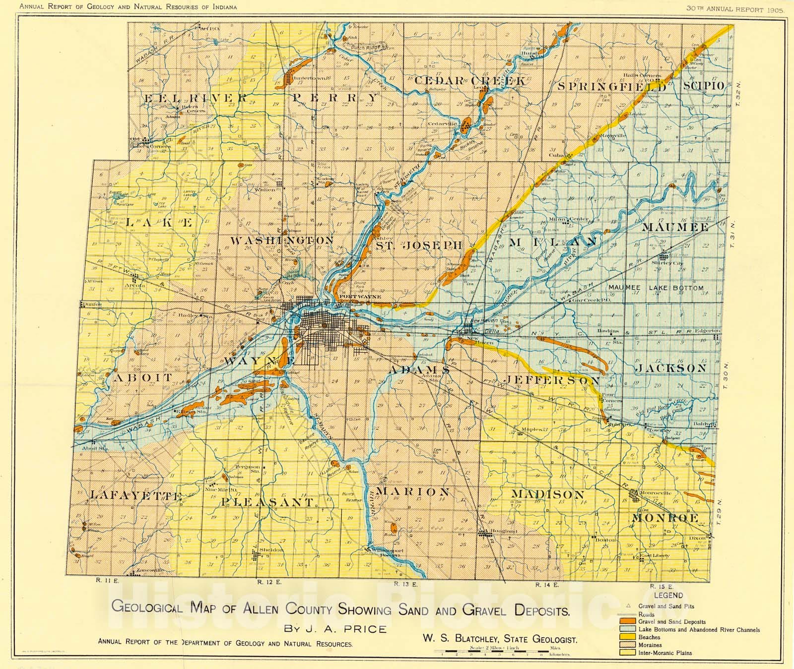 Historic Map : 1905 Geological Map of Allen County Showing Sand and Gravel Deposits : Vintage Wall Art