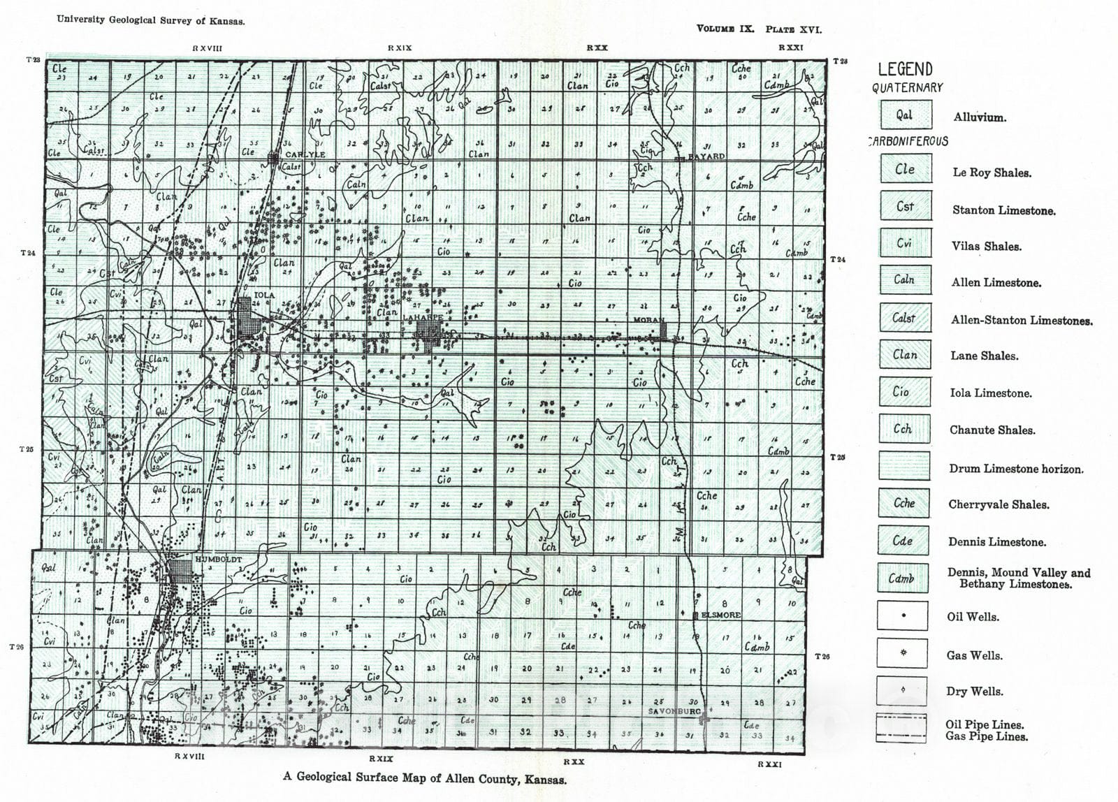 Vintage Map | 1908 A Geological Surface Map of Allen County, Kansas | University Geological Survey of Kansas