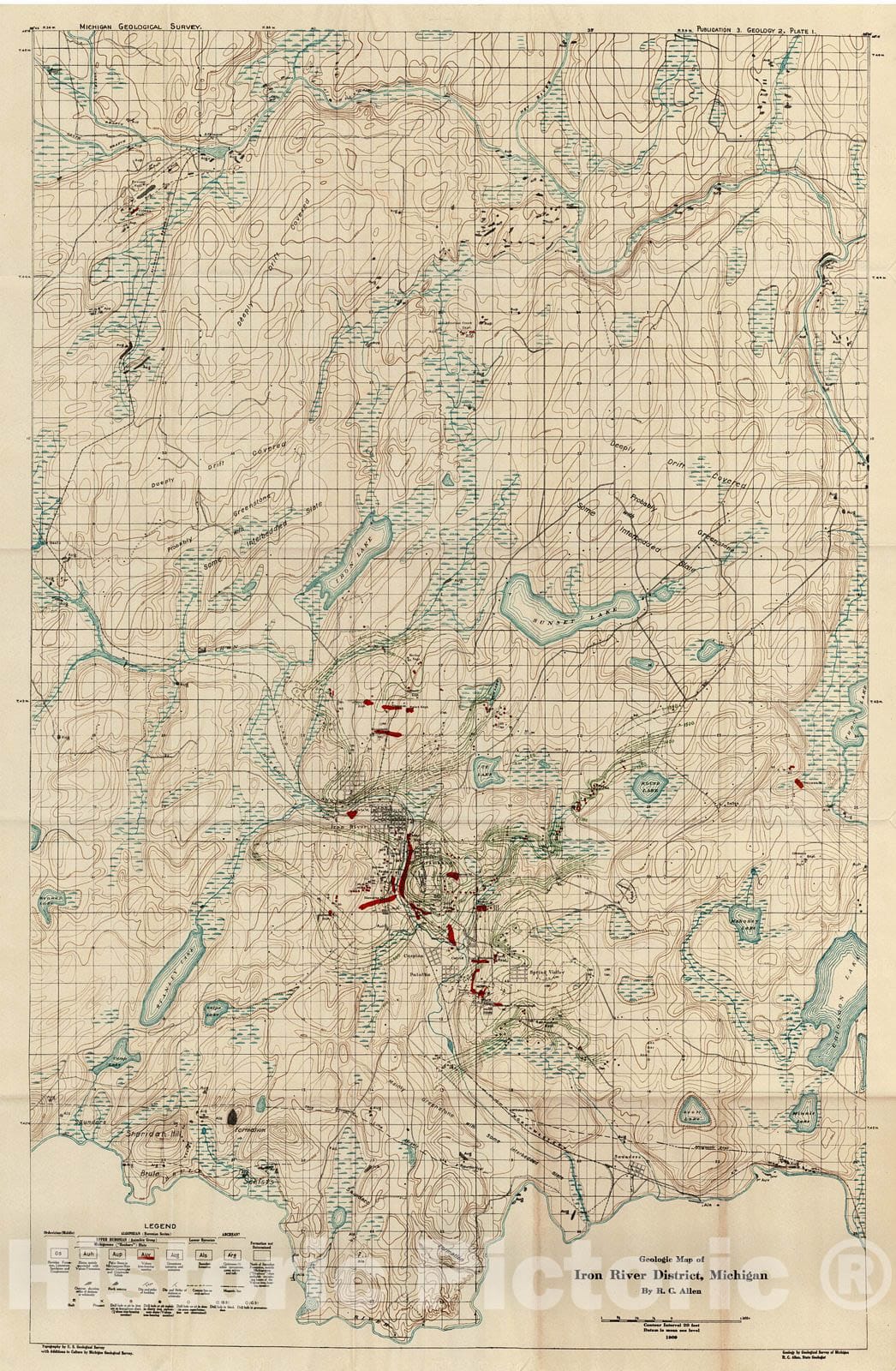 Vintage Map | 1909 Geologic Map of Iron River District, Michigan | Allen, R.C.