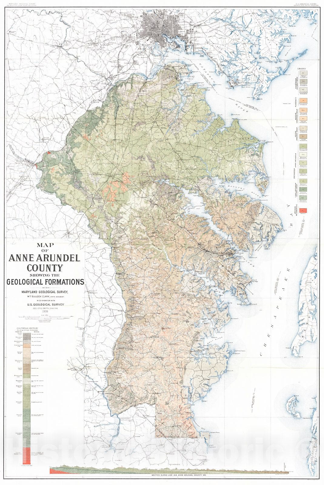 Historic Map : 1916 Map of Anne Arundel County Showing the Geological Formations : Vintage Wall Art