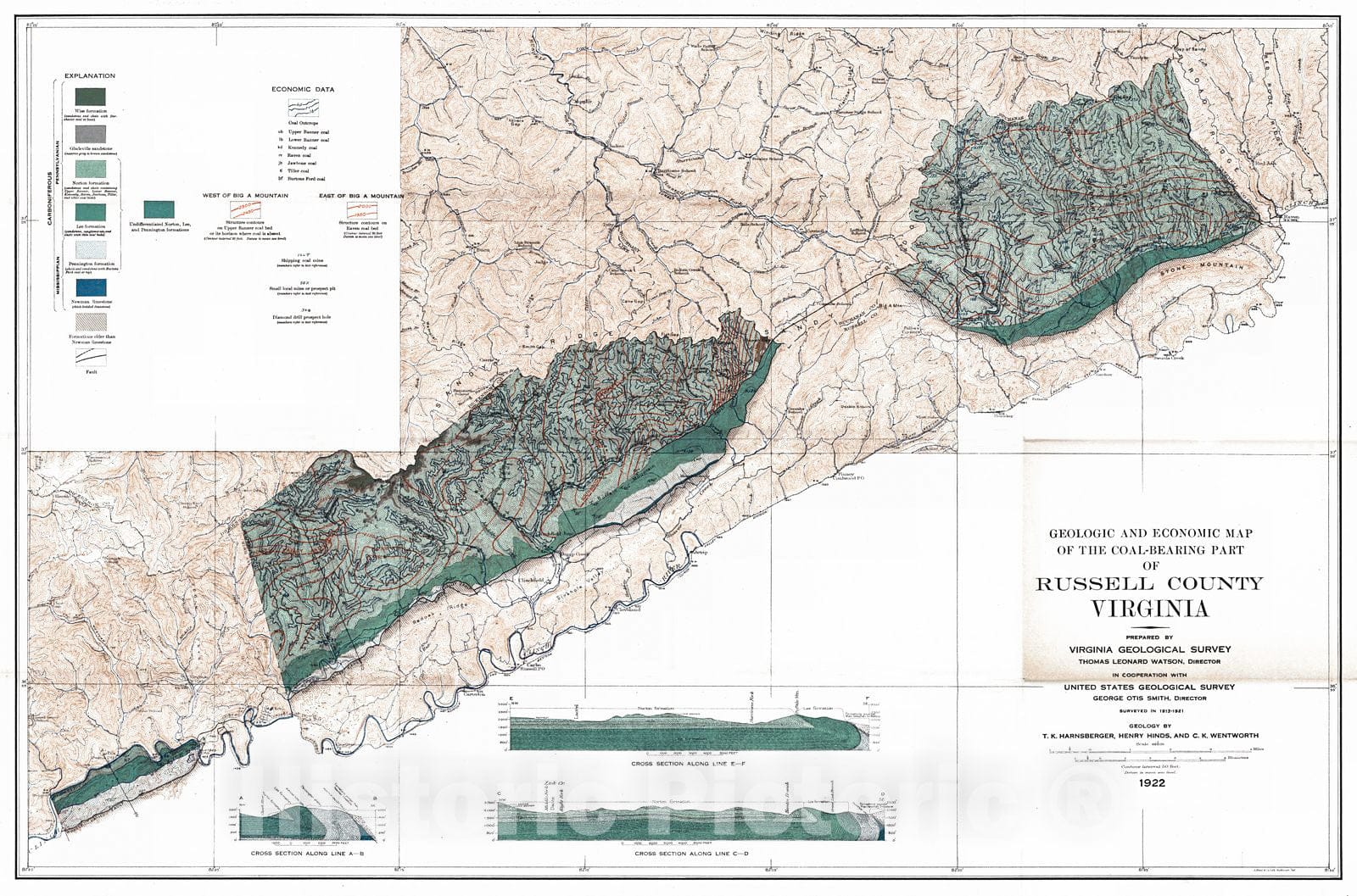 • .Historic Map : 1922 Geologic and Economic Map of the Coal-Bearing Part of Russell County, Virginia : Vintage Wall Art