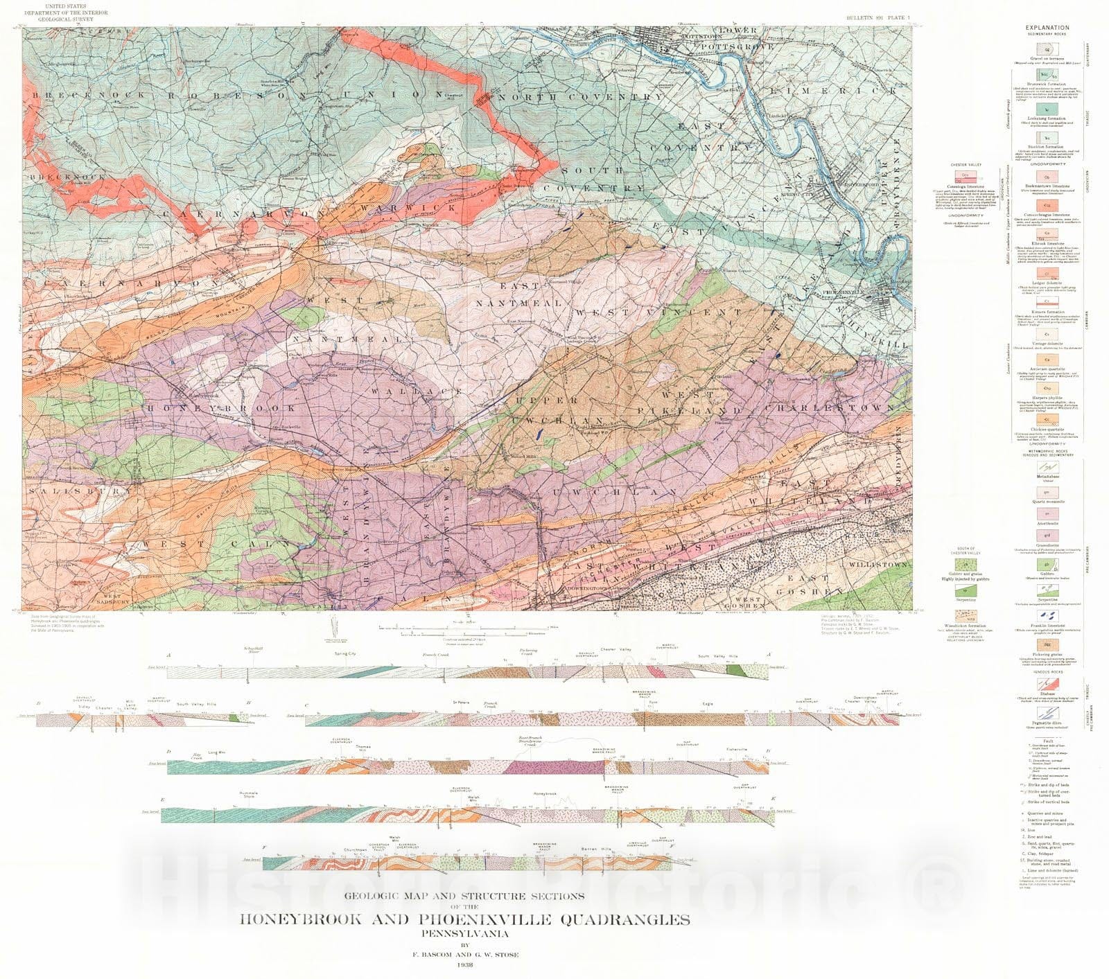 Historic Map : 1938 Geologic map and structure sections of the Honeybrook and Phoenixville quadrangles, Pennsylvania : Vintage Wall Art