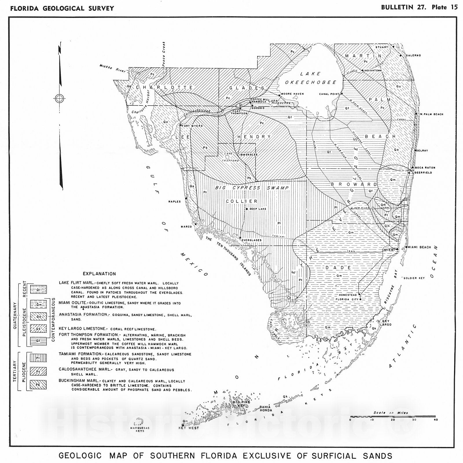 • .Historic Map : 1944 Geologic Map of Southern Florida Exclusive of Surficial Sands : Vintage Wall Art