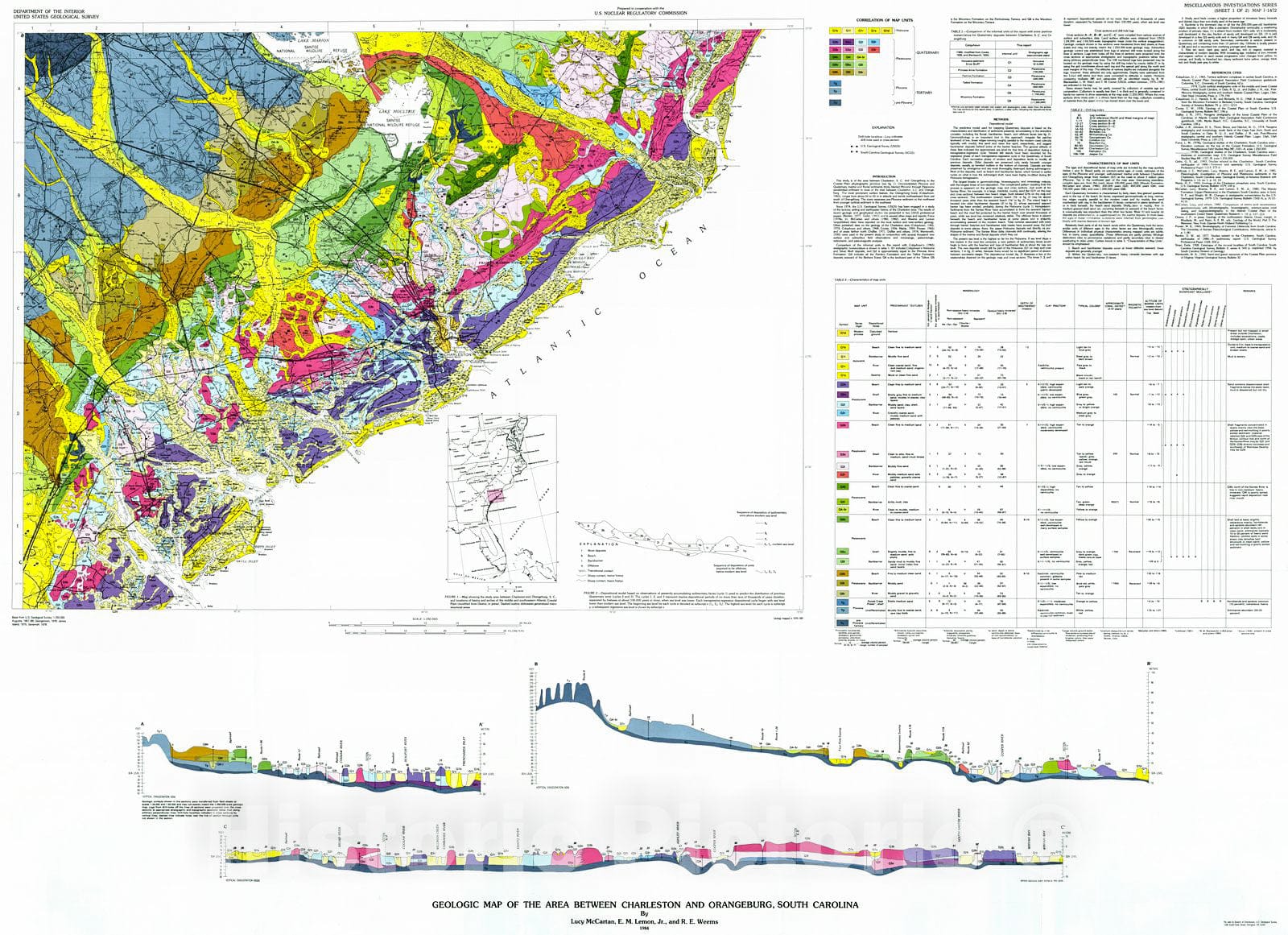 • .Historic Map : 1984 Geologic Map of the Area Between Charleston and Orangeburg, South Carolina : Vintage Wall Art