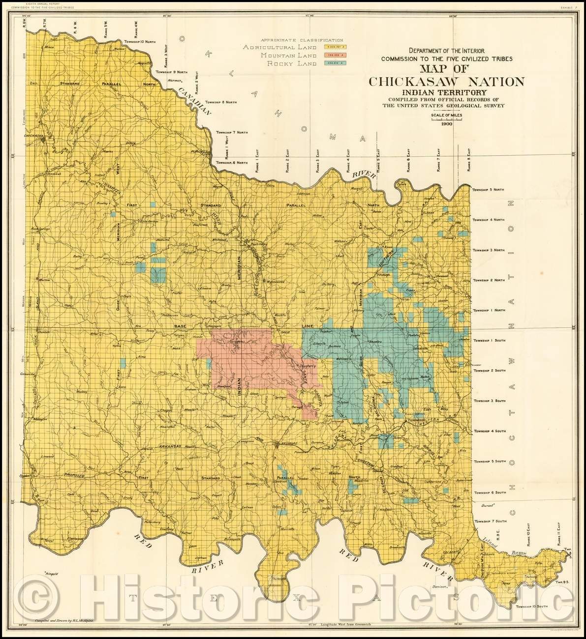 Historic Map - Department of the Interior Commission of the Five Civilized Tribes Map of Chickasaw Nation Indian Territory, 1900, U.S. Geological Survey - Vintage Wall Art