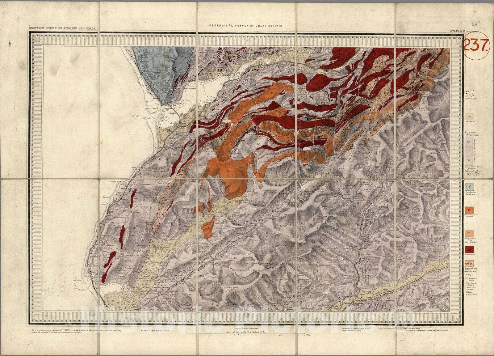 59. Barmouth, Machynlleth, NE Quad. | Ordnance Survey of Great Britain. Geological Survey of Great Britain. Old Series, One-Inch Map with National Grid, England and Wales. | This geological map series of England and Wales was published beginning in 1834 and is shown on the Ordnance Survey Old Series of One Inch to the Mile base maps (see our 6916.000). A total of 262 sheets were published through 1898: 52 full sheets, 2 half sheets, and 208 quarter sheets. Our current set has 215 sheets; we have put online the missing 47 sheets with images from the collection of the British Geological Survey, although we will be replacing those over time as we acquire the missing sheets. The geological coloring of these maps was done by hand painting well into the 20th century - at a time when most geological maps were produced by color lithography. The resulting color is rich and produces images of great scientific and artistic clarity. Additional information on the history of the publication of the geological survey and map series is available at http://www.charlesclosesociety.org. Map catalog dates shown in our Date field are generally based on the most recent year shown on the map, with exceptions described in the Notes field. Our Pub Date (average date of the whole set of 262) is the date of the newest map in this set of the series. Geological maps show the 'solid' (bedrock) geology and the 'drift' deposits (such as peat and glacial deposits) with equal emphasis, if both are shown. See marginalia to determine if the map shows drift geology (surficial) geology, or updates for levels (elevations), railways, and other natural and cultural features. Additional individual map sheet and series information, such as history and legend, is available at the British Geological Survey at http://www.bgs.ac.uk/data/historicalmaps/home.html