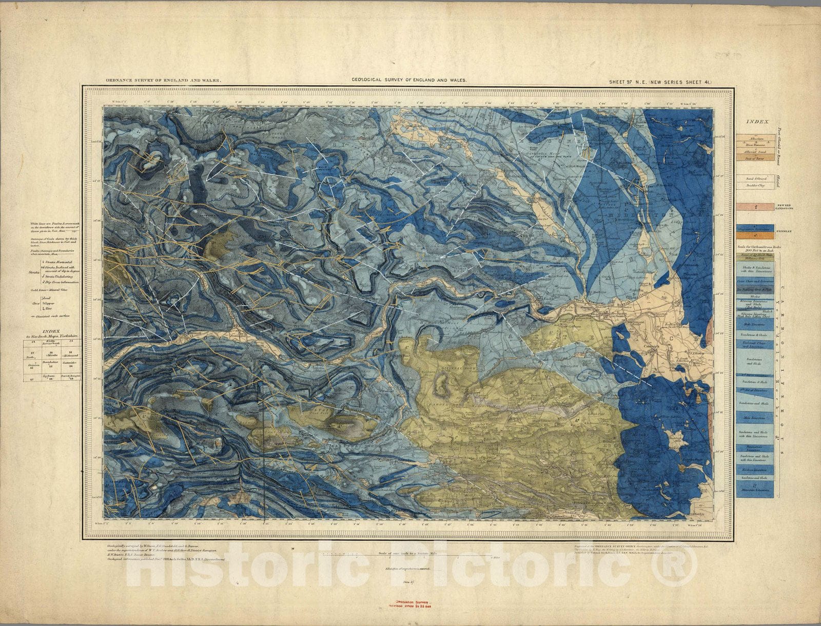 97. Richmond, NE Quad. | Ordnance Survey of Great Britain. Geological Survey of Great Britain. Old Series, One-Inch Map with National Grid, England and Wales. | This geological map series of England and Wales was published beginning in 1834 and is shown on the Ordnance Survey Old Series of One Inch to the Mile base maps (see our 6916.000). A total of 262 sheets were published through 1898: 52 full sheets, 2 half sheets, and 208 quarter sheets. Our current set has 215 sheets; we have put online the missing 47 sheets with images from the collection of the British Geological Survey, although we will be replacing those over time as we acquire the missing sheets. The geological coloring of these maps was done by hand painting well into the 20th century - at a time when most geological maps were produced by color lithography. The resulting color is rich and produces images of great scientific and artistic clarity. Additional information on the history of the publication of the geological survey and map series is available at http://www.charlesclosesociety.org. Map catalog dates shown in our Date field are generally based on the most recent year shown on the map, with exceptions described in the Notes field. Our Pub Date (average date of the whole set of 262) is the date of the newest map in this set of the series. Geological maps show the 'solid' (bedrock) geology and the 'drift' deposits (such as peat and glacial deposits) with equal emphasis, if both are shown. See marginalia to determine if the map shows drift geology (surficial) geology, or updates for levels (elevations), railways, and other natural and cultural features. Additional individual map sheet and series information, such as history and legend, is available at the British Geological Survey at http://www.bgs.ac.uk/data/historicalmaps/home.html