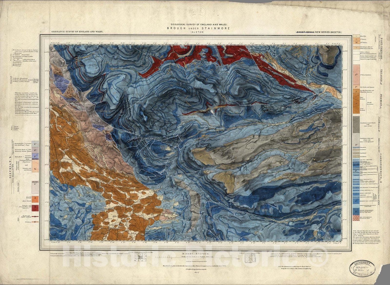 102. Alston, Brough under Stainmore, Appleby, SE Quad. | Ordnance Survey of Great Britain. Geological Survey of Great Britain. Old Series, One-Inch Map with National Grid, England and Wales. | This geological map series of England and Wales was published beginning in 1834 and is shown on the Ordnance Survey Old Series of One Inch to the Mile base maps (see our 6916.000). A total of 262 sheets were published through 1898: 52 full sheets, 2 half sheets, and 208 quarter sheets. Our current set has 215 sheets; we have put online the missing 47 sheets with images from the collection of the British Geological Survey, although we will be replacing those over time as we acquire the missing sheets. The geological coloring of these maps was done by hand painting well into the 20th century - at a time when most geological maps were produced by color lithography. The resulting color is rich and produces images of great scientific and artistic clarity. Additional information on the history of the publication of the geological survey and map series is available at http://www.charlesclosesociety.org. Map catalog dates shown in our Date field are generally based on the most recent year shown on the map, with exceptions described in the Notes field. Our Pub Date (average date of the whole set of 262) is the date of the newest map in this set of the series. Geological maps show the 'solid' (bedrock) geology and the 'drift' deposits (such as peat and glacial deposits) with equal emphasis, if both are shown. See marginalia to determine if the map shows drift geology (surficial) geology, or updates for levels (elevations), railways, and other natural and cultural features. Additional individual map sheet and series information, such as history and legend, is available at the British Geological Survey at http://www.bgs.ac.uk/data/historicalmaps/home.html