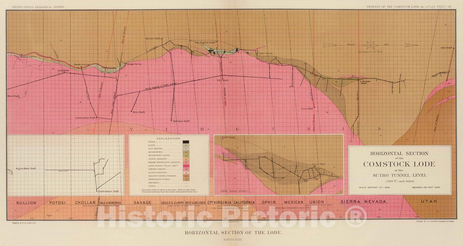 Historic Map : Geologic Atlas - 1882 Horizontal Section of the Comstock Lode at the Sutro Tunnel Level (North End). - Vintage Wall Art