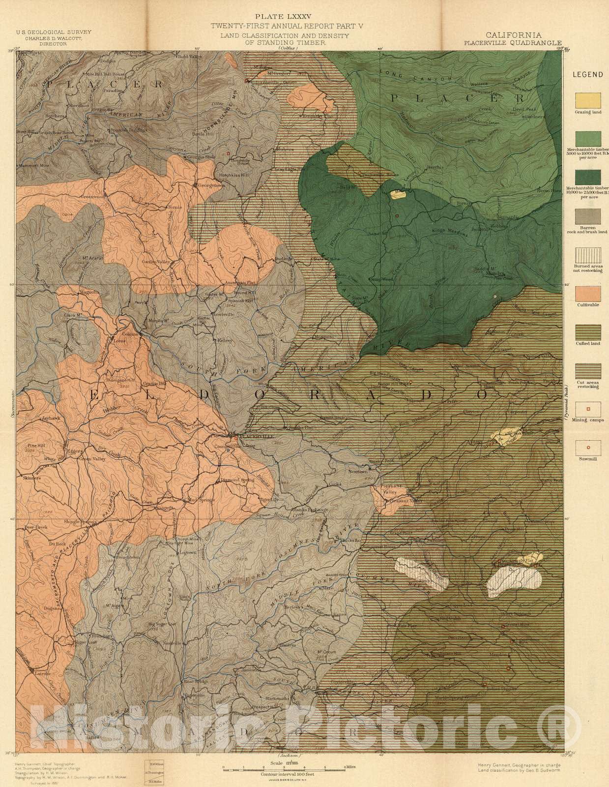 • .Historic Map : Geologic Atlas - 1887 Plate LXXXV. Placerville Quadrangle, Land Classification and Density of Standing Timber. - Vintage Wall Art