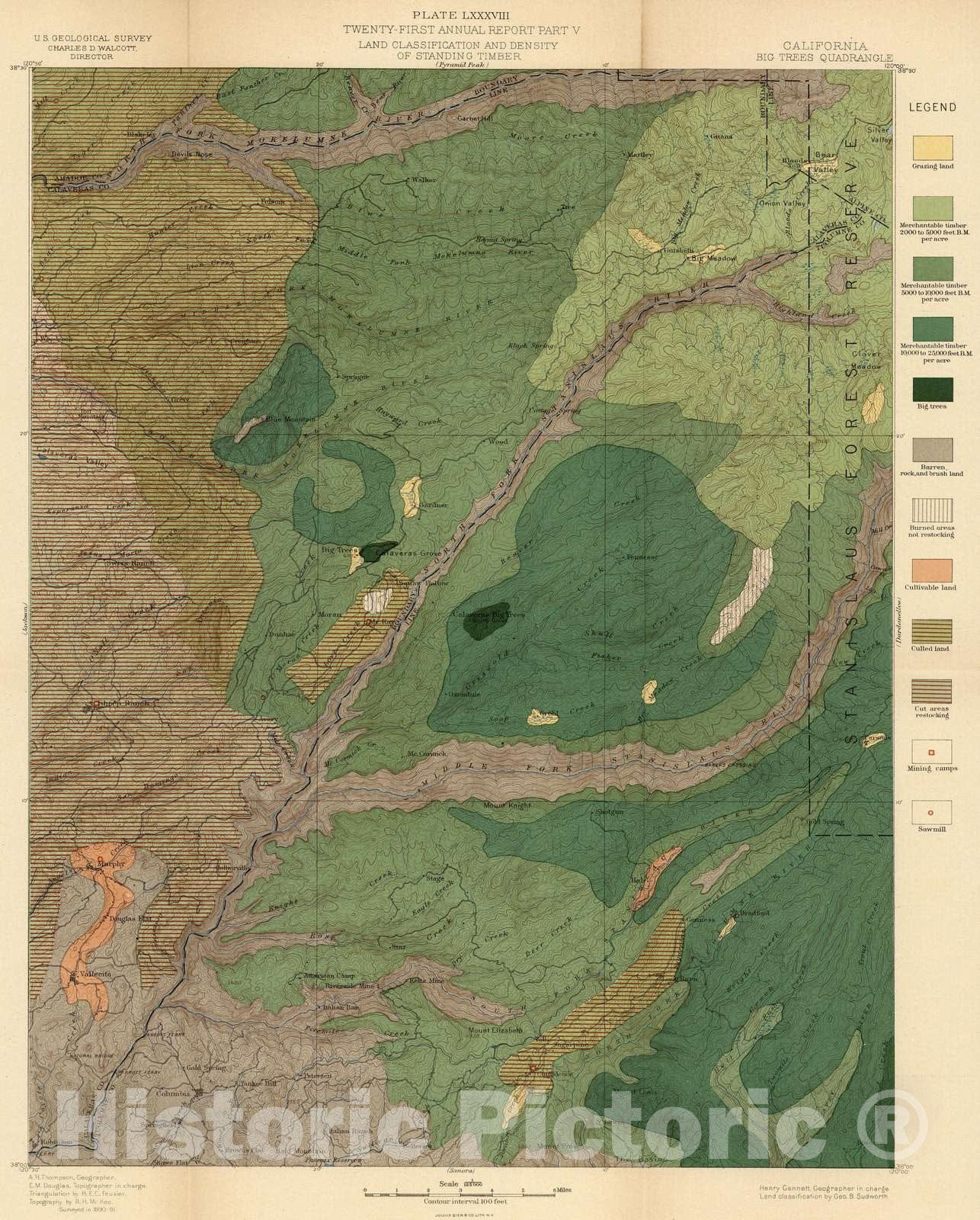 Historic Map : Geologic Atlas - 1891 Plate LXXXVIII. Big Trees Quadrangle, California. Land Classification and Density of Standing Timber. - Vintage Wall Art