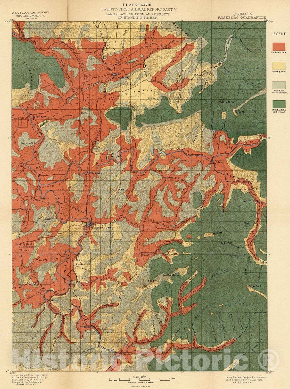 Historic Map : Geologic Atlas - 1900 Plate CXXVIII. Roseburg Quadrangle, Oregon, Land Classification and Density of Standing Timber. - Vintage Wall Art