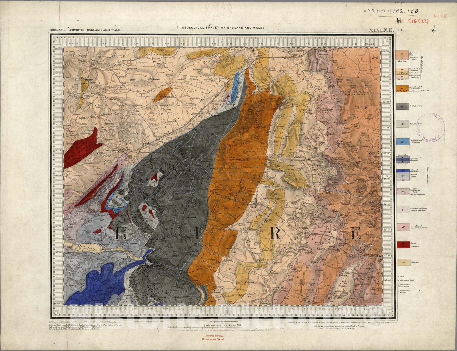 61. Wellington, Shrewsbury, NE Quad. | Ordnance Survey of Great Britain. Geological Survey of Great Britain. Old Series, One-Inch Map with National Grid, England and Wales. | This geological map series of England and Wales was published beginning in 1834 and is shown on the Ordnance Survey Old Series of One Inch to the Mile base maps (see our 6916.000). A total of 262 sheets were published through 1898: 52 full sheets, 2 half sheets, and 208 quarter sheets. Our current set has 215 sheets; we have put online the missing 47 sheets with images from the collection of the British Geological Survey, although we will be replacing those over time as we acquire the missing sheets. The geological coloring of these maps was done by hand painting well into the 20th century - at a time when most geological maps were produced by color lithography. The resulting color is rich and produces images of great scientific and artistic clarity. Additional information on the history of the publication of the geological survey and map series is available at http://www.charlesclosesociety.org. Map catalog dates shown in our Date field are generally based on the most recent year shown on the map, with exceptions described in the Notes field. Our Pub Date (average date of the whole set of 262) is the date of the newest map in this set of the series. Geological maps show the 'solid' (bedrock) geology and the 'drift' deposits (such as peat and glacial deposits) with equal emphasis, if both are shown. See marginalia to determine if the map shows drift geology (surficial) geology, or updates for levels (elevations), railways, and other natural and cultural features. Additional individual map sheet and series information, such as history and legend, is available at the British Geological Survey at http://www.bgs.ac.uk/data/historicalmaps/home.html