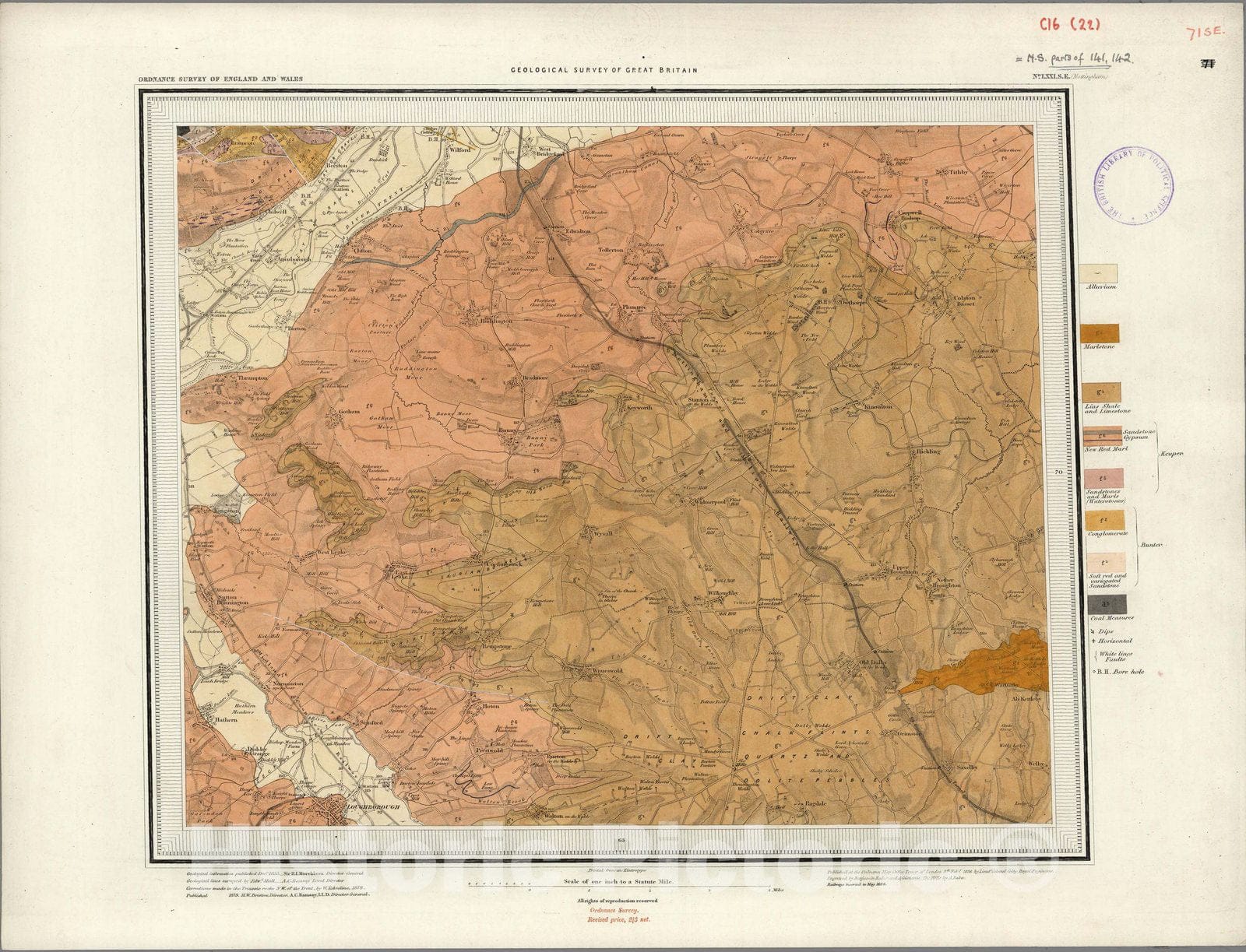 71. Kenworth, Nottingham, SE Quad. | Ordnance Survey of Great Britain. Geological Survey of Great Britain. Old Series, One-Inch Map with National Grid, England and Wales. | This geological map series of England and Wales was published beginning in 1834 and is shown on the Ordnance Survey Old Series of One Inch to the Mile base maps (see our 6916.000). A total of 262 sheets were published through 1898: 52 full sheets, 2 half sheets, and 208 quarter sheets. Our current set has 215 sheets; we have put online the missing 47 sheets with images from the collection of the British Geological Survey, although we will be replacing those over time as we acquire the missing sheets. The geological coloring of these maps was done by hand painting well into the 20th century - at a time when most geological maps were produced by color lithography. The resulting color is rich and produces images of great scientific and artistic clarity. Additional information on the history of the publication of the geological survey and map series is available at http://www.charlesclosesociety.org. Map catalog dates shown in our Date field are generally based on the most recent year shown on the map, with exceptions described in the Notes field. Our Pub Date (average date of the whole set of 262) is the date of the newest map in this set of the series. Geological maps show the 'solid' (bedrock) geology and the 'drift' deposits (such as peat and glacial deposits) with equal emphasis, if both are shown. See marginalia to determine if the map shows drift geology (surficial) geology, or updates for levels (elevations), railways, and other natural and cultural features. Additional individual map sheet and series information, such as history and legend, is available at the British Geological Survey at http://www.bgs.ac.uk/data/historicalmaps/home.html
