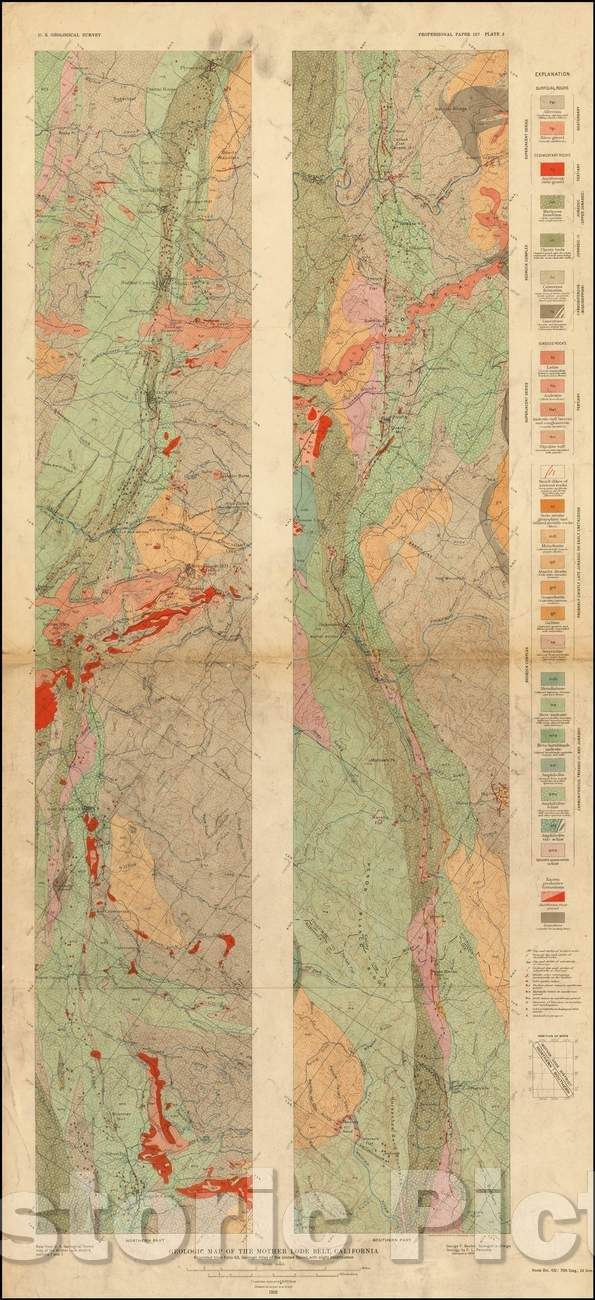 • .Historic Map - Geological Map of the Mother Lode Belt, California, 1928, U.S. Geological Survey - Vintage Wall Art