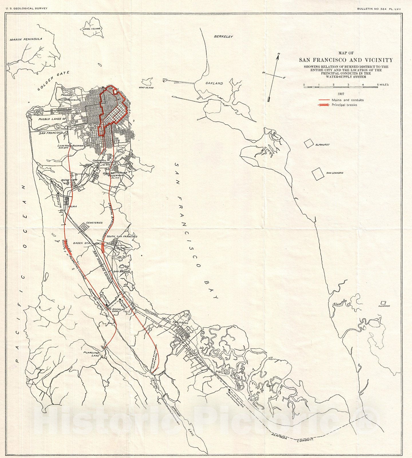 An unusual map of San Francisco Peninsula and part of San Francisco Bay dating to 1907. This map was published by the U.S. Geological Survey following the terrible San Francisco Earthquake and Fire of 1806. This natural disaster, comparable to the devastation wrought by Hurricane Katrina, is considered the largest is California History. This map highlights the developed parts of San Francisco most damaged by the fire in red ink. It also shows the water conduits that supply the city. Published in the U.S. Geological Survey's 1907 report on the San Francisco Earthquake and Fire.