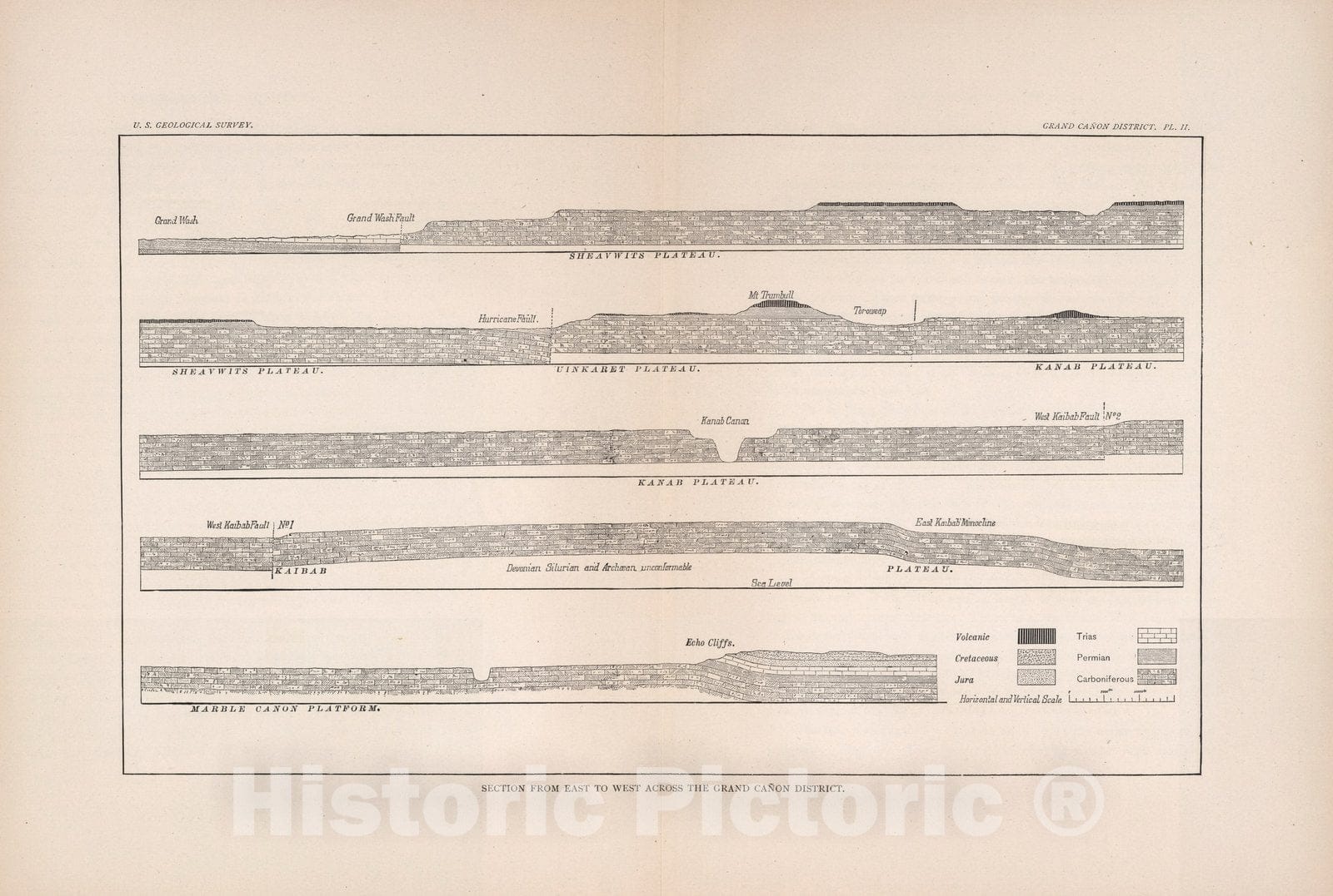 Historic Map : Geology Book, Geologic Cross-Section: Pl. II. Section from East to West across the Grand Canyon District. 1882 - Vintage Wall Art