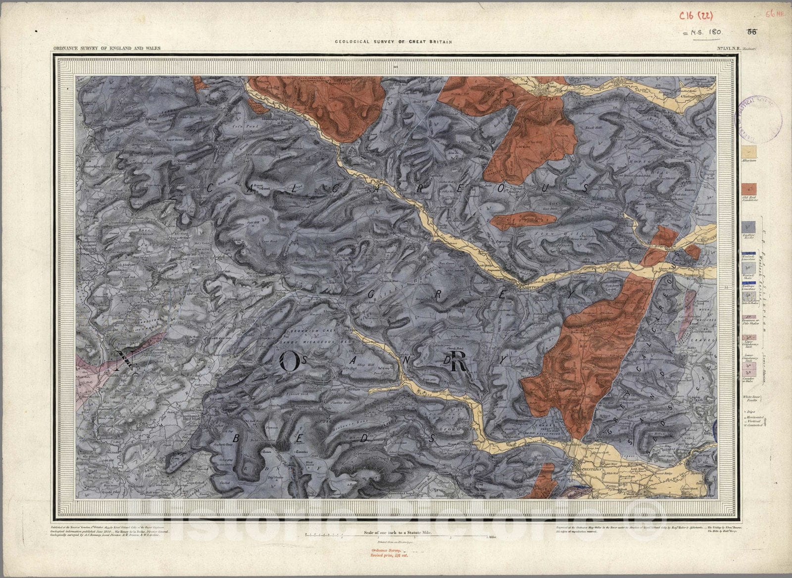 56. Knighton, Radnor, NE Quad. | Ordnance Survey of Great Britain. Geological Survey of Great Britain. Old Series, One-Inch Map with National Grid, England and Wales. | This geological map series of England and Wales was published beginning in 1834 and is shown on the Ordnance Survey Old Series of One Inch to the Mile base maps (see our 6916.000). A total of 262 sheets were published through 1898: 52 full sheets, 2 half sheets, and 208 quarter sheets. Our current set has 215 sheets; we have put online the missing 47 sheets with images from the collection of the British Geological Survey, although we will be replacing those over time as we acquire the missing sheets. The geological coloring of these maps was done by hand painting well into the 20th century - at a time when most geological maps were produced by color lithography. The resulting color is rich and produces images of great scientific and artistic clarity. Additional information on the history of the publication of the geological survey and map series is available at http://www.charlesclosesociety.org. Map catalog dates shown in our Date field are generally based on the most recent year shown on the map, with exceptions described in the Notes field. Our Pub Date (average date of the whole set of 262) is the date of the newest map in this set of the series. Geological maps show the 'solid' (bedrock) geology and the 'drift' deposits (such as peat and glacial deposits) with equal emphasis, if both are shown. See marginalia to determine if the map shows drift geology (surficial) geology, or updates for levels (elevations), railways, and other natural and cultural features. Additional individual map sheet and series information, such as history and legend, is available at the British Geological Survey at http://www.bgs.ac.uk/data/historicalmaps/home.html