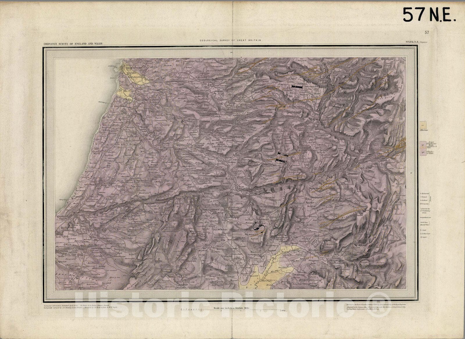 57. Tregaron, NE Quad. | Ordnance Survey of Great Britain. Geological Survey of Great Britain. Old Series, One-Inch Map with National Grid, England and Wales. | This geological map series of England and Wales was published beginning in 1834 and is shown on the Ordnance Survey Old Series of One Inch to the Mile base maps (see our 6916.000). A total of 262 sheets were published through 1898: 52 full sheets, 2 half sheets, and 208 quarter sheets. Our current set has 215 sheets; we have put online the missing 47 sheets with images from the collection of the British Geological Survey, although we will be replacing those over time as we acquire the missing sheets. The geological coloring of these maps was done by hand painting well into the 20th century - at a time when most geological maps were produced by color lithography. The resulting color is rich and produces images of great scientific and artistic clarity. Additional information on the history of the publication of the geological survey and map series is available at http://www.charlesclosesociety.org. Map catalog dates shown in our Date field are generally based on the most recent year shown on the map, with exceptions described in the Notes field. Our Pub Date (average date of the whole set of 262) is the date of the newest map in this set of the series. Geological maps show the 'solid' (bedrock) geology and the 'drift' deposits (such as peat and glacial deposits) with equal emphasis, if both are shown. See marginalia to determine if the map shows drift geology (surficial) geology, or updates for levels (elevations), railways, and other natural and cultural features. Additional individual map sheet and series information, such as history and legend, is available at the British Geological Survey at http://www.bgs.ac.uk/data/historicalmaps/home.html