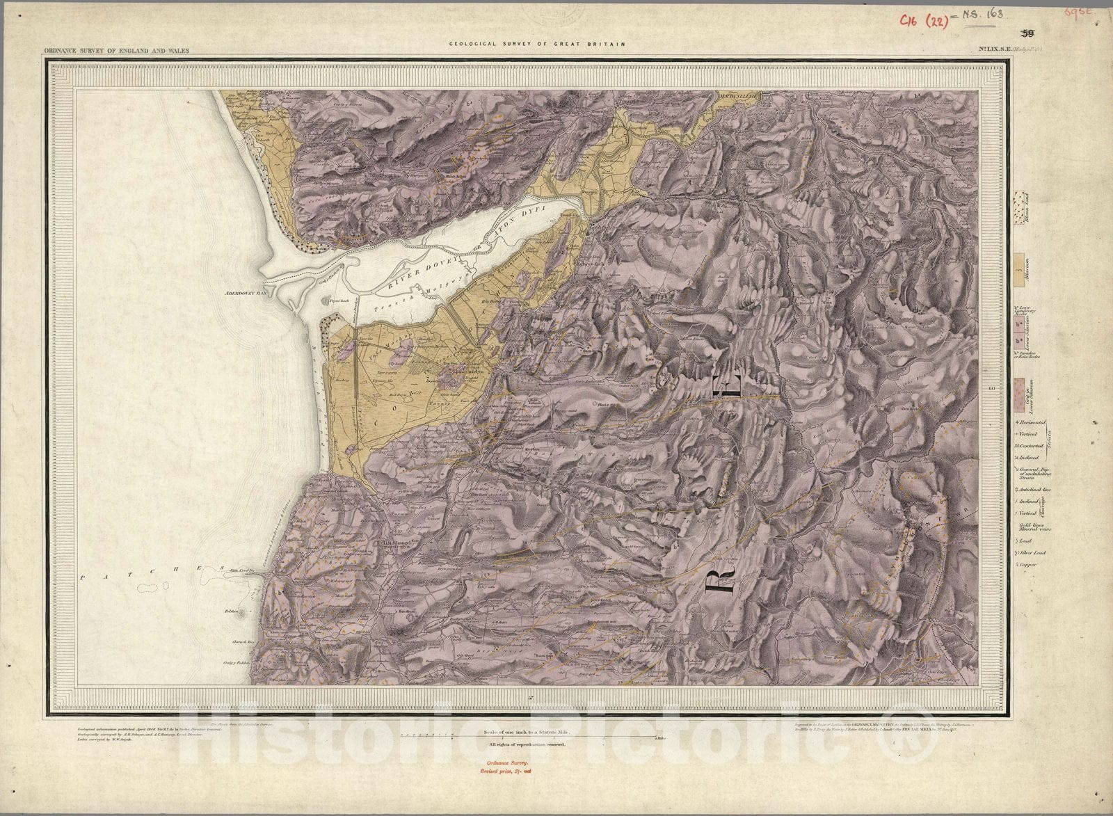 59. Machynlleth, SE Quad. | Ordnance Survey of Great Britain. Geological Survey of Great Britain. Old Series, One-Inch Map with National Grid, England and Wales. | This geological map series of England and Wales was published beginning in 1834 and is shown on the Ordnance Survey Old Series of One Inch to the Mile base maps (see our 6916.000). A total of 262 sheets were published through 1898: 52 full sheets, 2 half sheets, and 208 quarter sheets. Our current set has 215 sheets; we have put online the missing 47 sheets with images from the collection of the British Geological Survey, although we will be replacing those over time as we acquire the missing sheets. The geological coloring of these maps was done by hand painting well into the 20th century - at a time when most geological maps were produced by color lithography. The resulting color is rich and produces images of great scientific and artistic clarity. Additional information on the history of the publication of the geological survey and map series is available at http://www.charlesclosesociety.org. Map catalog dates shown in our Date field are generally based on the most recent year shown on the map, with exceptions described in the Notes field. Our Pub Date (average date of the whole set of 262) is the date of the newest map in this set of the series. Geological maps show the 'solid' (bedrock) geology and the 'drift' deposits (such as peat and glacial deposits) with equal emphasis, if both are shown. See marginalia to determine if the map shows drift geology (surficial) geology, or updates for levels (elevations), railways, and other natural and cultural features. Additional individual map sheet and series information, such as history and legend, is available at the British Geological Survey at http://www.bgs.ac.uk/data/historicalmaps/home.html