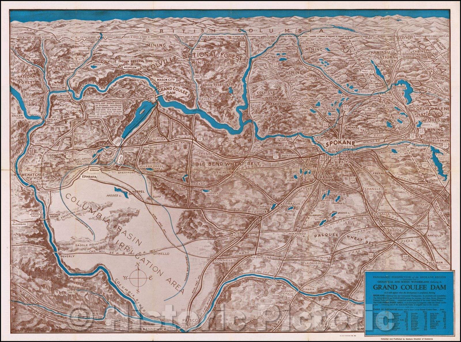 Historic Map - Panoramic Perspective of the Spokane Region including the Geological and Scenic Wonderland Embracing the Columbia Basin Irrigation Project, 1935 - Vintage Wall Art