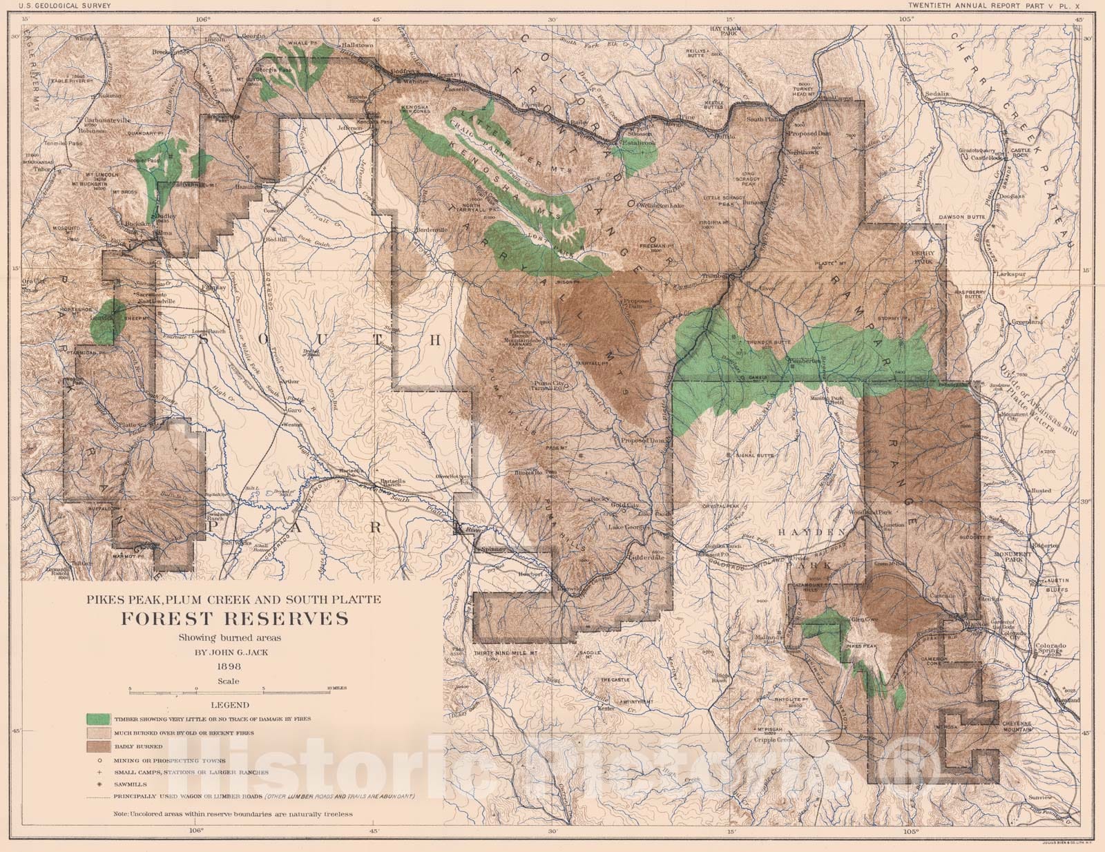 Historic Map - Pikes Peak, Plum Creek and South Platte Forest Reserves Showing burned areas, 1898, U.S. Geological Survey v1