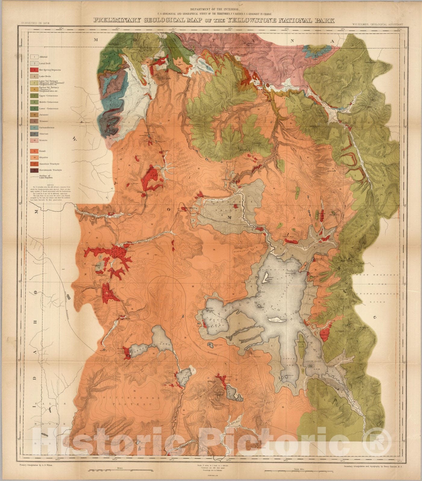 Preliminary Geological Map of the Yellowstone National Park. Department of the Interior, U.S. Geological and Geographical Survey of the Territories ; F.V. Hayden, U.S. Geologist in Charge ; W.H. Holmes, Geological Assistant ; Primary Triangulation by A.D. Wilson ; Secondary Triangulation and Topography by Henry Gannett. Surveyed in 1878. Julius Bien, Lith. | Preliminary Geological Map of the Yellowstone National Park. Department of the Interior, U.S. Geological and Geographical Survey of the Territories ; F.V. Hayden, U.S. Geologist in Charge ; W.H. Holmes, Geological Assistant ; Primary Triangulation by A.D. Wilson ; Secondary Triangulation and Topography by Henry Gannett. Surveyed in 1878. Julius Bien, Lith. | Full color map. Relief shown by contours and spot heights. Depths shown by soundings. Includes sedimentary chart. and notes. No. 6 on verso. To accompany the Survey's 12th annual report (1878).