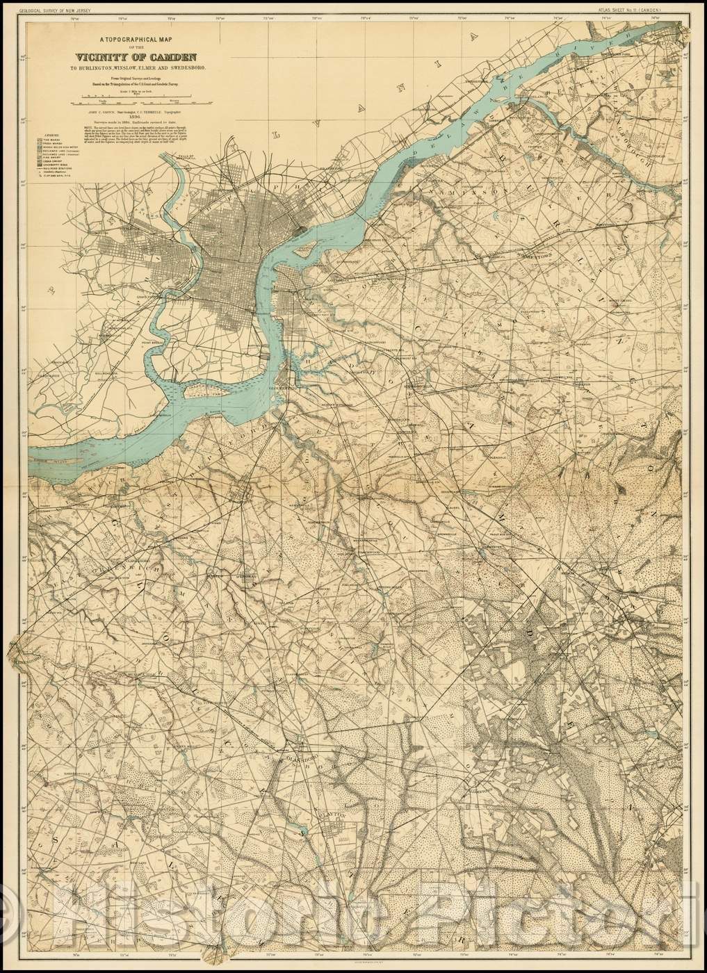 Historic Map - A Topographical Map of the Vicinity of Camden to Burlington, Winslow, Elmer and Swedeboro, 1896, Geological Survey of New Jersey - Vintage Wall Art