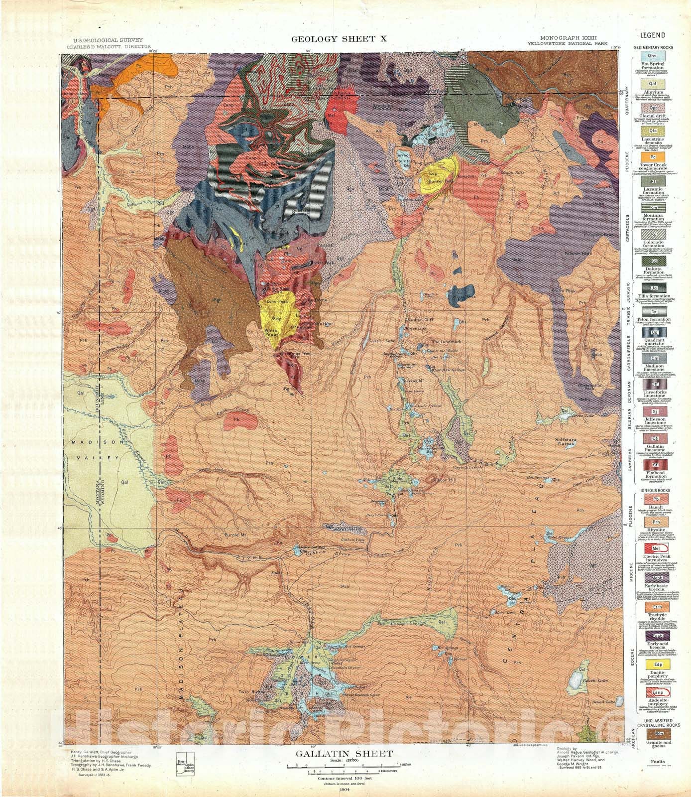 Historic Map : USGS Geologic Gallatin, Yellowstone National Park, 1904, Vintage Wall Art